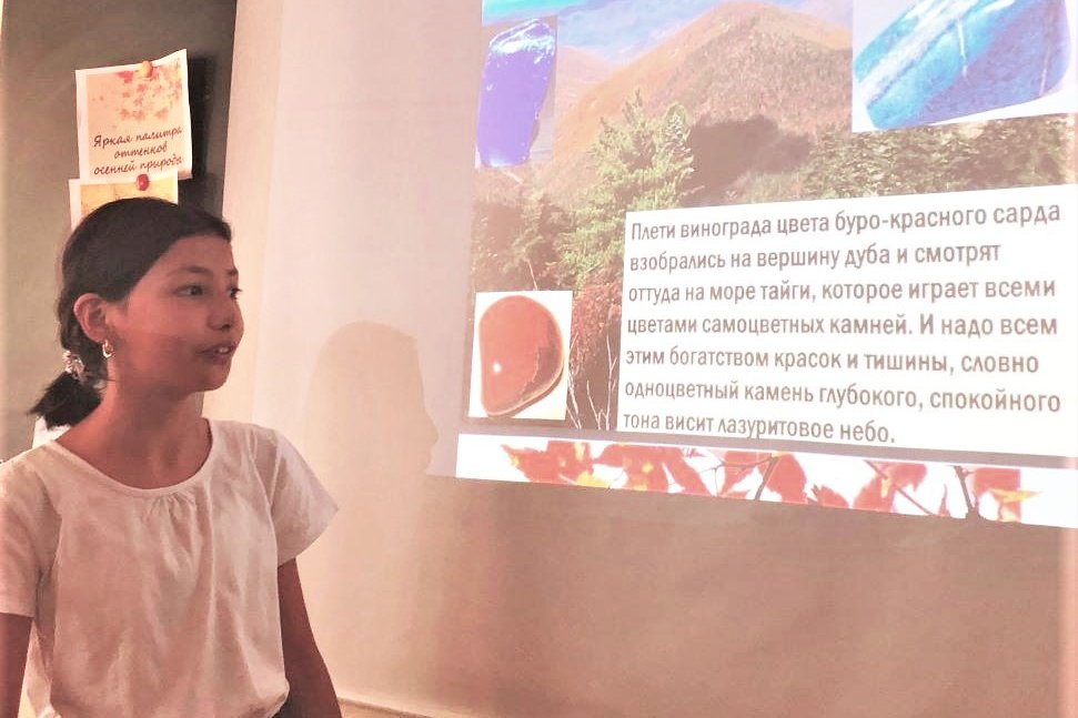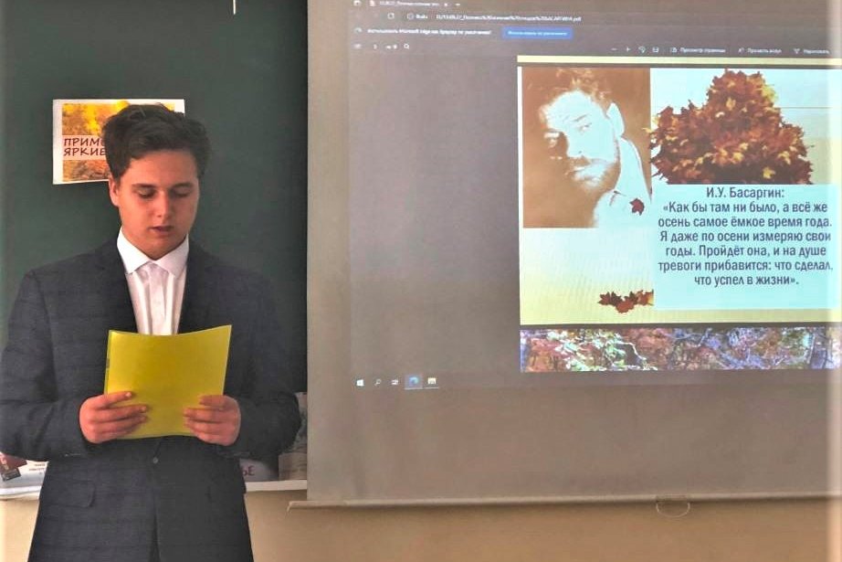 После просмотра электронной презентации «Приморья яркие пейзажи» с завораживающим разноцветьем красок осени, ребятам была представлена исследовательская работа «Поэтика осенних этюдов И.У. Басаргина». Юный исследователь отметил, что Иван Ульянович хорошо чувствовал то, о чем писал, а слова, вырывавшиеся из его души, звучали выразительно и проникновенно, поэтому и ныне читатели видят яркие и живые образы, созданные им. В приведенных в исследовании осенних текстах И.У. Басаргина автором были выявлены разнообразные средства художественной выразительности: метафоры, олицетворения, сравнения, эпитеты, из которых преобладают метафоры, которых писателем было использовано более пятидесяти. Звуковая организация рассматриваемых текстов (система различных звуковых повторов, задающая систему дополнительных связей между словами и строками) вносит в их структуру определенные элементы сказового стиля. И всё это обилие выразительных средств входит в более широкое понятие – поэтику творчества И.У. Басаргина.