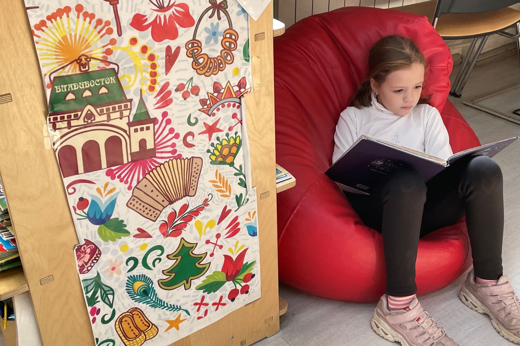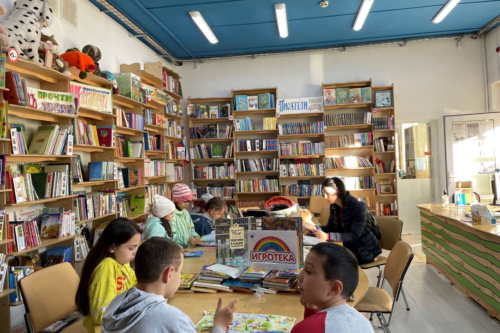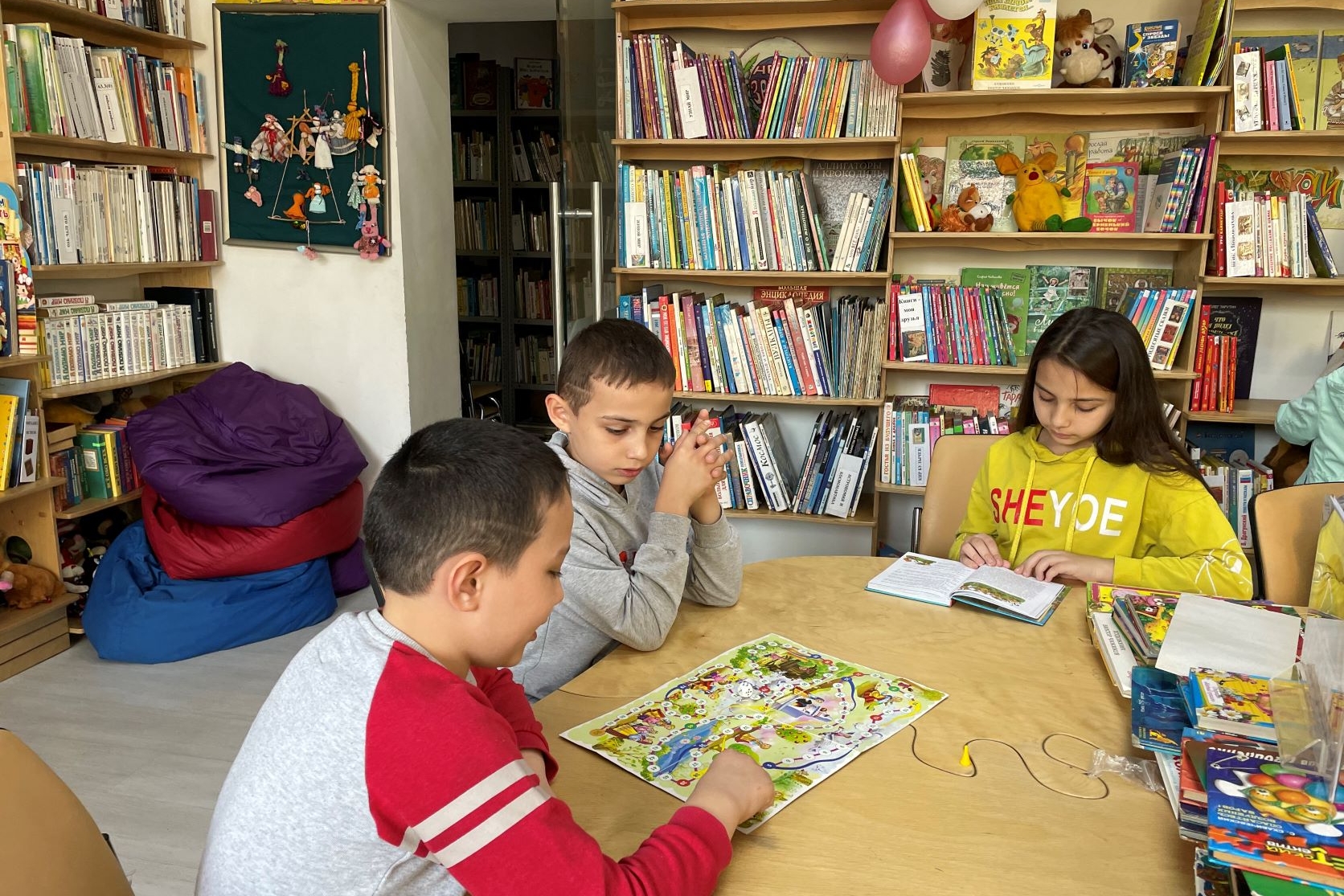 Дети с интересом играют в настольные игры, устроившись за столом, а другие удобно располагаются на мягких пуфах, чтобы почитать любимую книгу или полистать журнал.