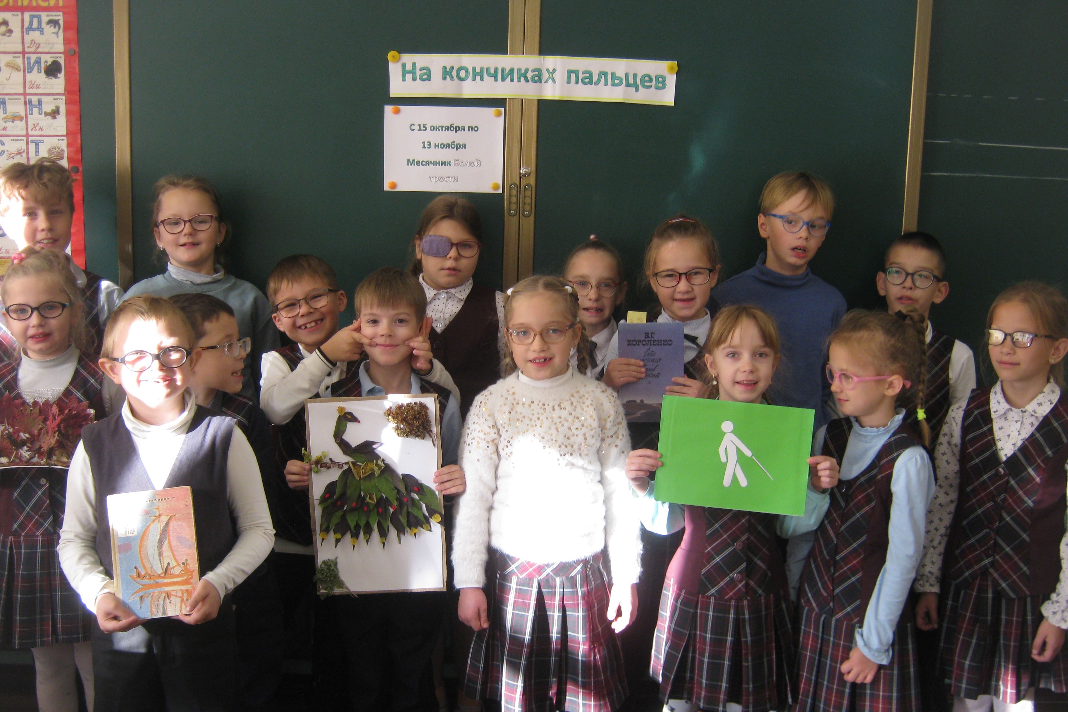 Участники мероприятия ш/с № 3, познакомились с историей памятного дня, поучаствовали в обзоре книг, для них была представлена сказка Бориса Шергина «Куричья слепота». Сказка о наивной девице, не видящей в темное время суток и барине, решившем подшутить над ней. Сказку дети прослушали и вынесли свой вердикт: барин злой человек, так шутить нельзя. Зато обзор книги В.Г. Короленко им понравился. Полюбился мальчик Петя, любовно называемого мамой Петрусь, мальчик был слеп, но его глазами были кончики пальцев и прекрасный слух. Петя и стал музыкантом, потому что так тонко чувствовал и слышал, что звуки сами «выскакивали» с его пальчиков. Понравилась школьникам и книга В. Крапивина. «Та сторона, где ветер» — о маленьком бесстрашном слепом маленьком Ильке и его друзьях, которые ценили дружбу выше всяких сокровищ. Книгу дети оставили в классе, чтобы всем вместе прочитать ее и обсудить более обстоятельно.