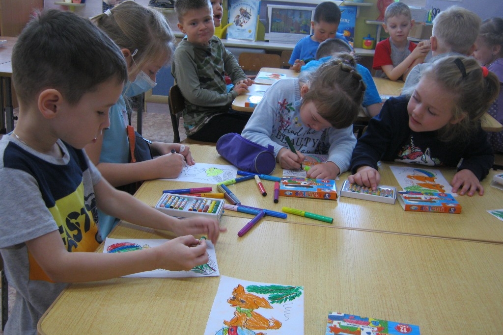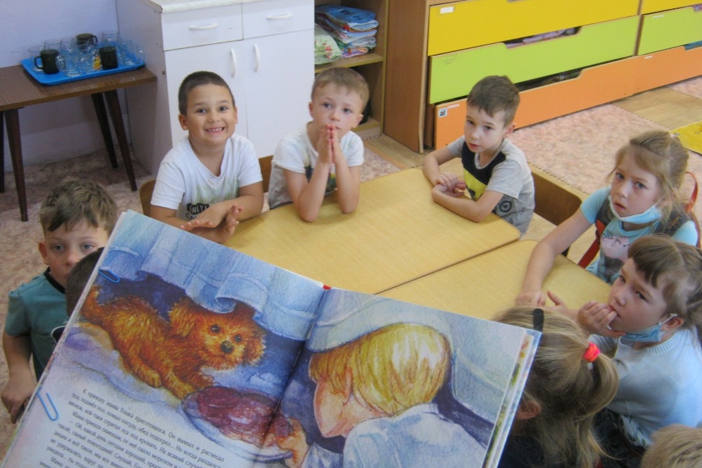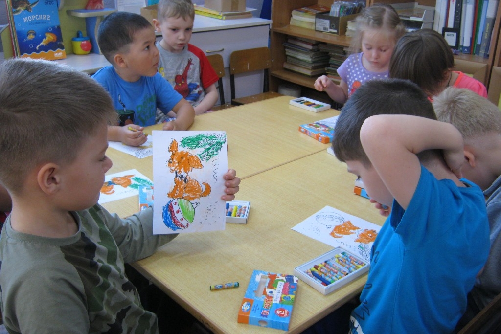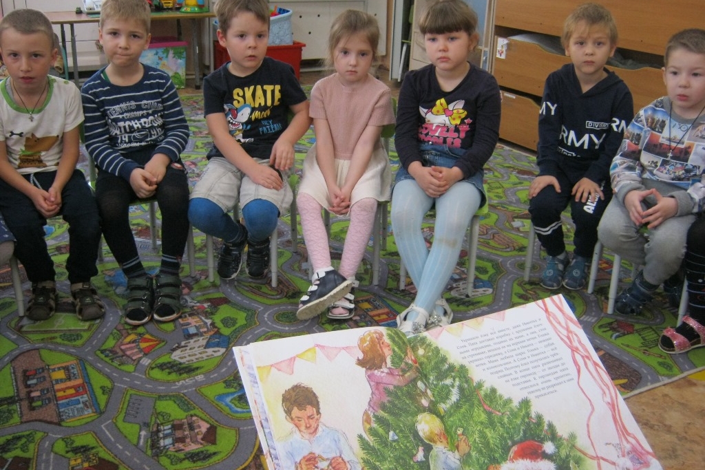 Дети детского сада №80 продолжают знакомиться с Библиотекой Деда Мороза. 4 декабря из библиотеки №8 в гости к ним пришла сказка Тамары Михеевой «Елочная история». Какой ребенок не мечтает о собаке, но не у всех семей есть возможность взять домой щенка. В волшебной новогодней истории, придуманной Тамарой Михеевой, родители мальчика Гоши оставляют щенка, но не простого, а который временами превращается в елочную игрушку. А заколдовывает рыжего щенка Дика чудесная елка, между прочим, искусственная, на приобретении которой настоял папа Гоши. Раскрашивая, дети рассказывали, у кого какая дома есть живность и показали аквариум с улитками на окне в детском саду.