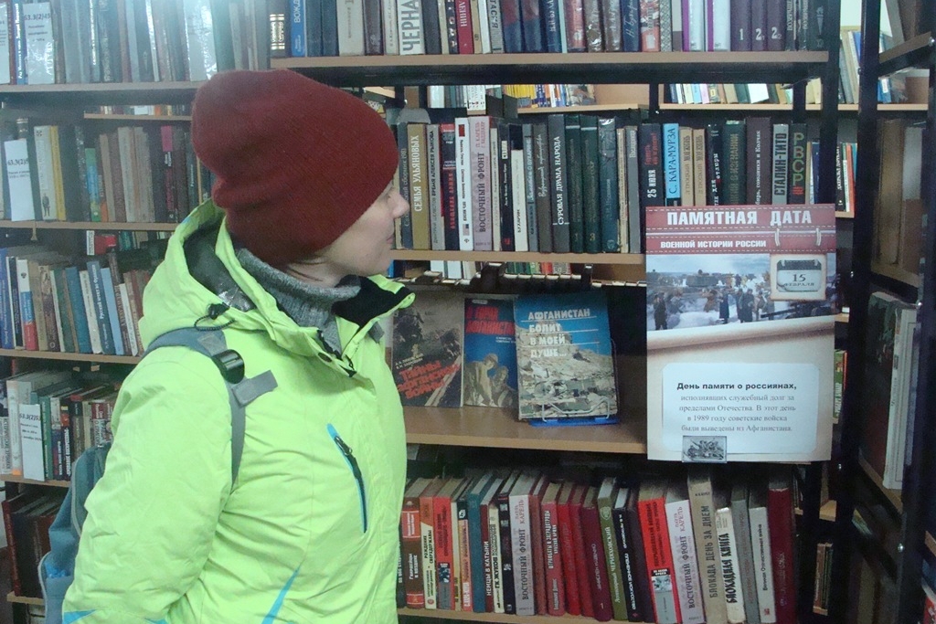 Старшее поколение знакомились с выставкой книг. Особенно их заинтересовали произведения военные мемуары майора Василия Ульяновича Полищука, непосредственного участника тех событий. В своей книге «Пограничники в Афганистане» он рассказывает о десантно – штурмовых группах и пограничной авиации по защите границы СССР с территории Афганистана. Книга А. Проханова «Дворец», «Дерево в центре Кабула», была написана к 30 летию вывода советских солдат с территории сопредельного государства, но в библиотеку романы поступили недавно, потому с большим интересом слушали краткий обзор книги и каждый брал себе на заметку, обязательно прочитать.