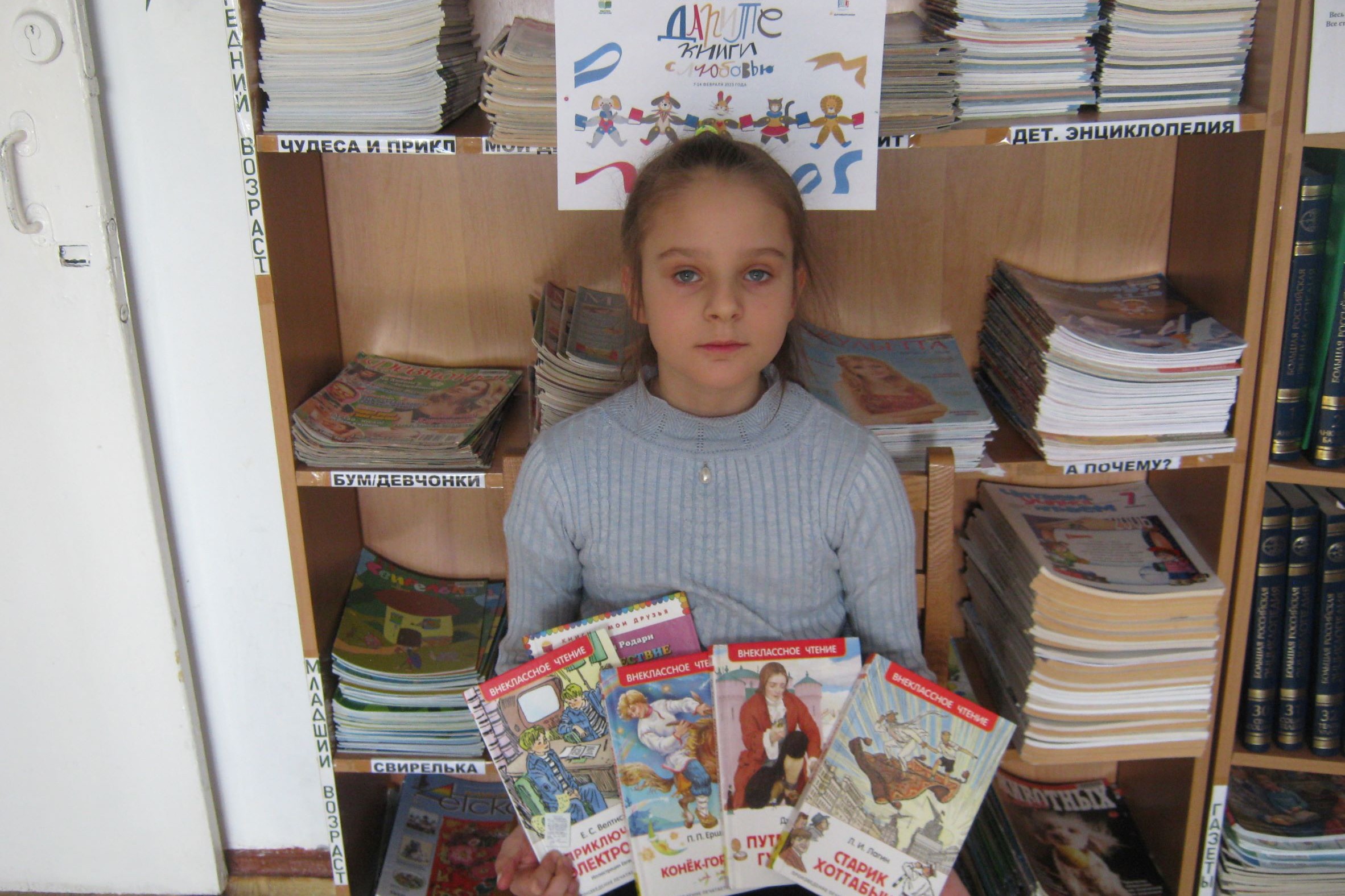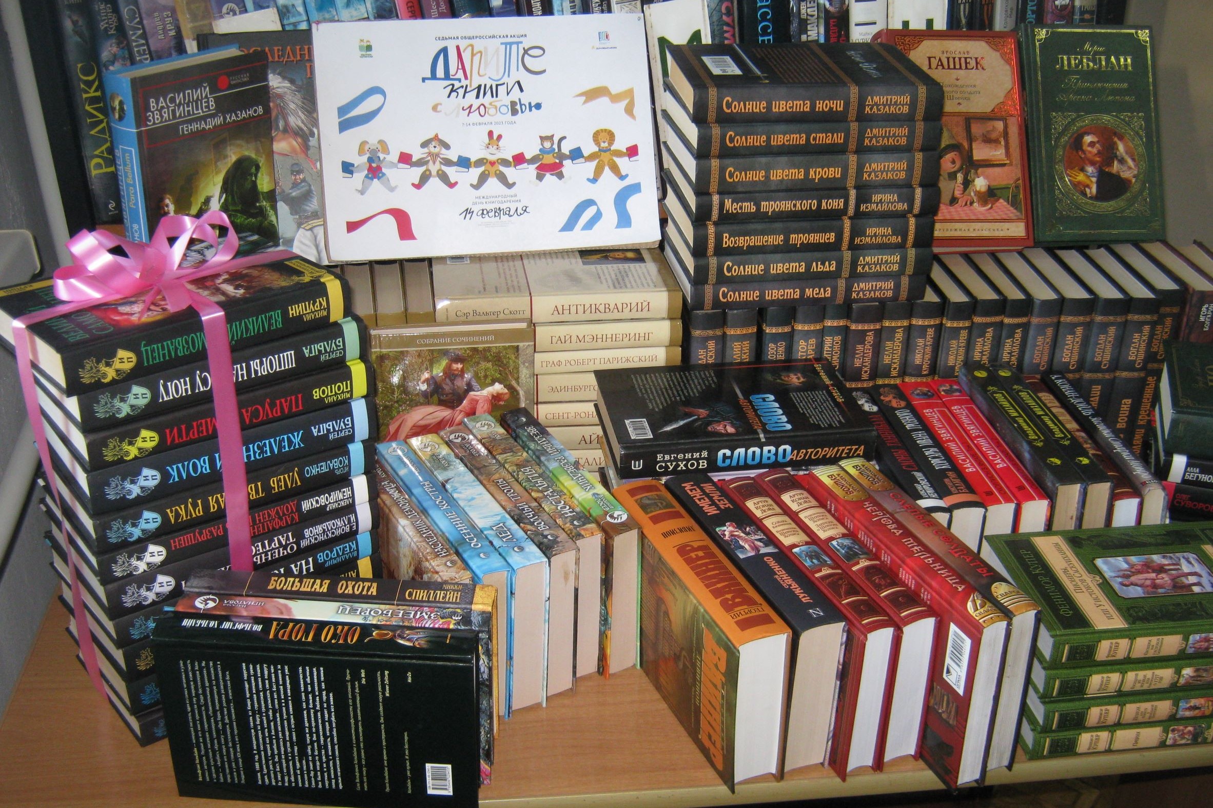 Библиотека благодарит Тобину Ольгу Эдуардовну – за качественную подборку приключенческой литературы. Мажукина Алексея Константиновича – за книги детективы. Скворцову Юлию Валерьевну и ее дочь Веронику – за серию книг «Исторические приключения». А также Прядко Полину, Висингириеву Луизу, Приказчикову Полину и всех тех, кто принял участие в акции «Дарите книги с любовью 2023!»