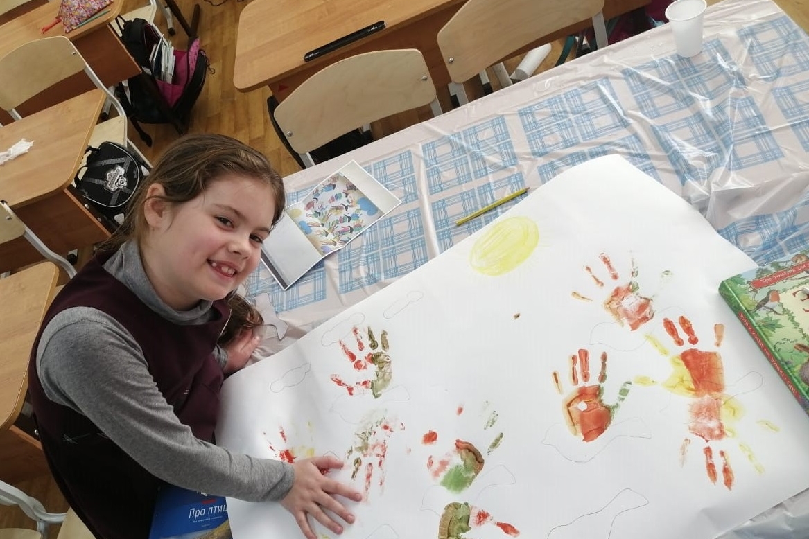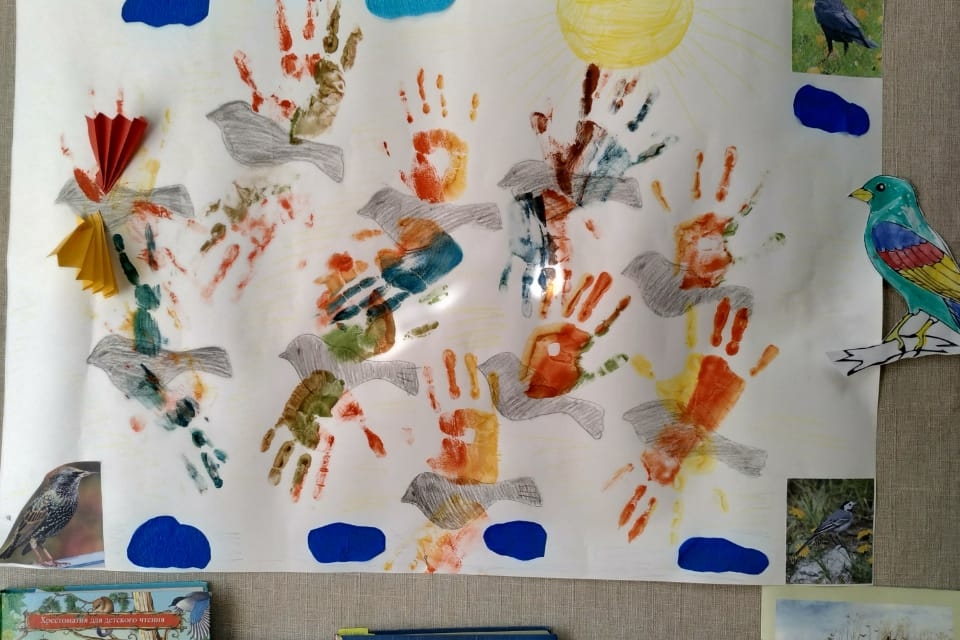 Дети с удовольствием посмотрели видеосюжет «Перелётные птицы весной», постарались запомнить названия птиц, услышали, как мелодично выводят свои трели дрозд, соловей и жаворонок. Ребята узнали, куда улетают зимовать птицы и почему важно ранней весной продолжать подкармливать пернатых. Затем познакомились с интересной и познавательной книгой «Почему птицы не падают?» Автором которой является научный журналист, биолог – Ильи Колмановский. В завершении нашего путешествия, ребята изобразили перелетных птиц, которые дружно возвращаются на родину. Детские ладошки стали крыльями, а разноцветная гуашь помогла оставить их отпечатки.