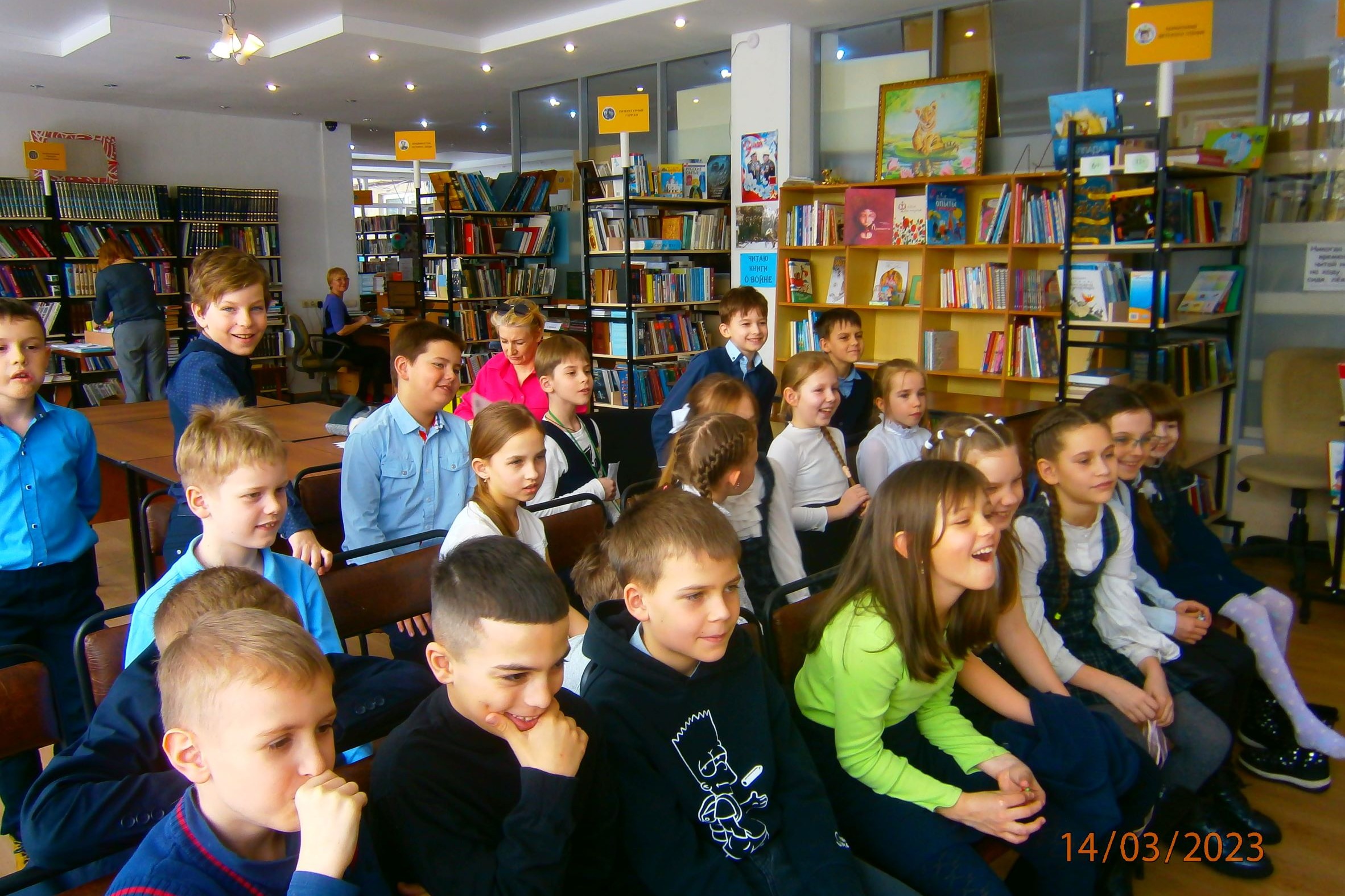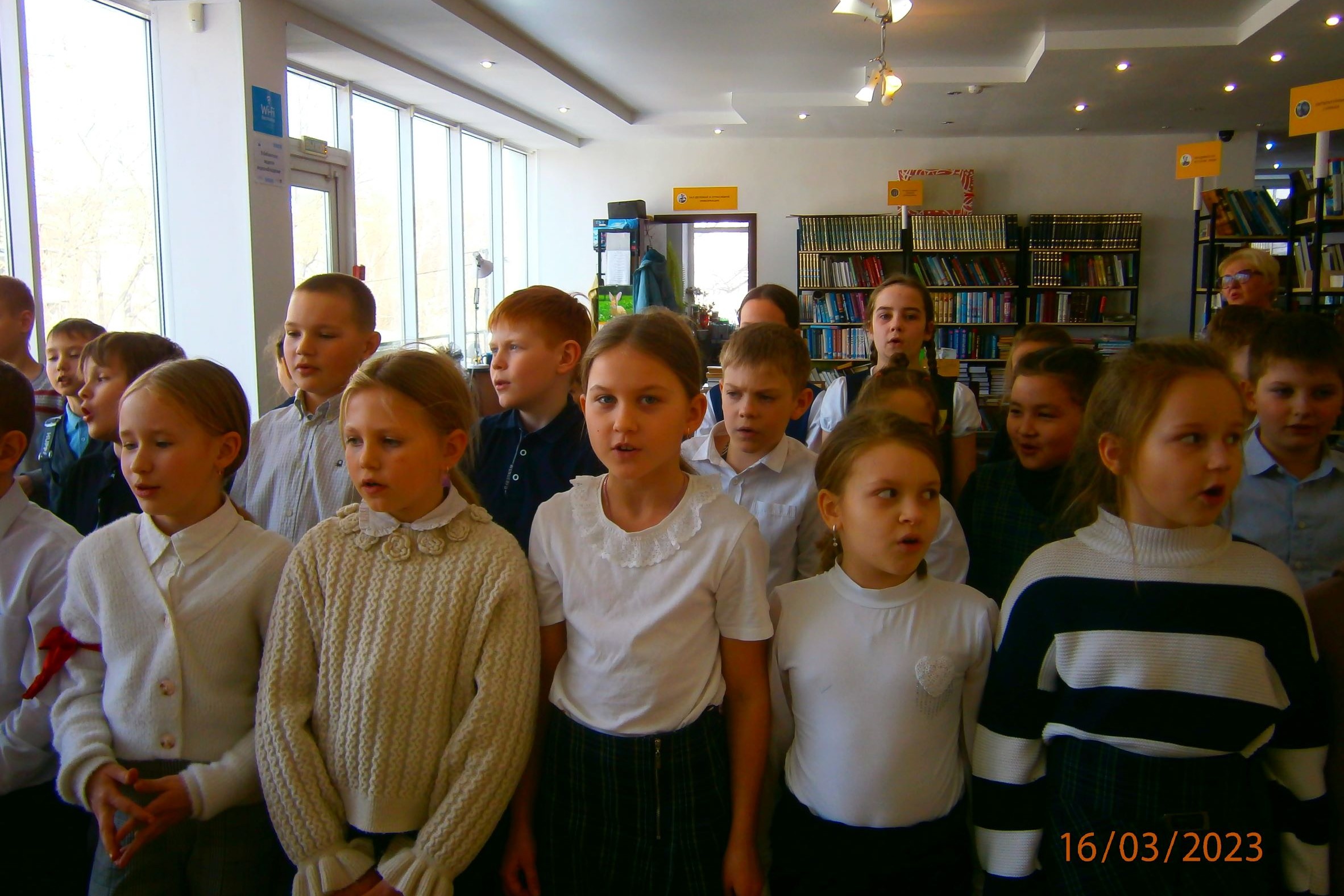 Следующими участниками литературного часа «А что у вас?» по творчеству Сергея Михалкова 16 марта в библиотеке № 3 стали учащиеся 2-б класса МБДОУ СОШ № 26. Они очень хорошо подготовились выучили стихи и с удовольствием их декламировали. Получилась своеобразная литературная викторина: один начинает, остальные хором продолжают. Ребята стоя исполнили гимн России. На старых кинохрониках о Неделе детской книги ребята с восторгом обнаружили не только Сергея Михалкова, но и Агнию Барто, Виталия Бианки, Евгения Чарушина и даже Самуила Маршака.