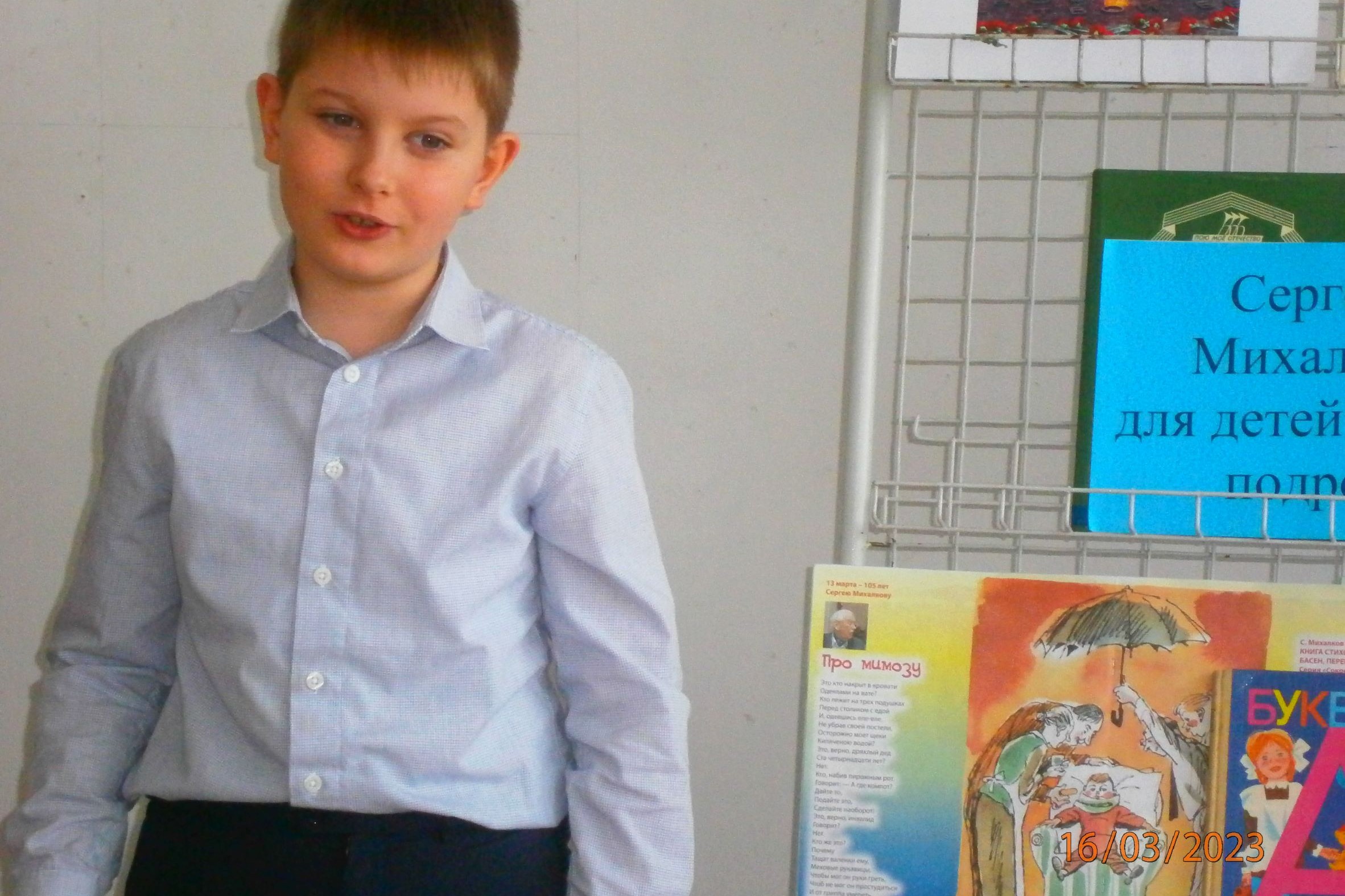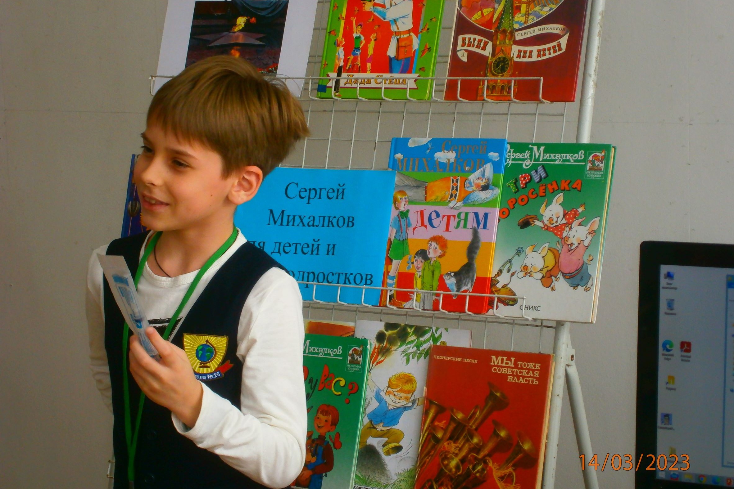 Час поэзии «Мы с приятелем», приуроченных к 110-летию со дня рождения С.В. Михалкова организовала 14 марта библиотека № 3 для детей 2-а класса школы № 26. Школьники посмотрели презентацию о жизни и творчестве Сергея Михалкова. Ребята хорошо подготовились к мероприятию, выучили стихи и с удовольствием их декламировали. Получилась своеобразная литературная викторина: один начинает, остальные хором продолжают. Ребята стоя исполнили гимн России.