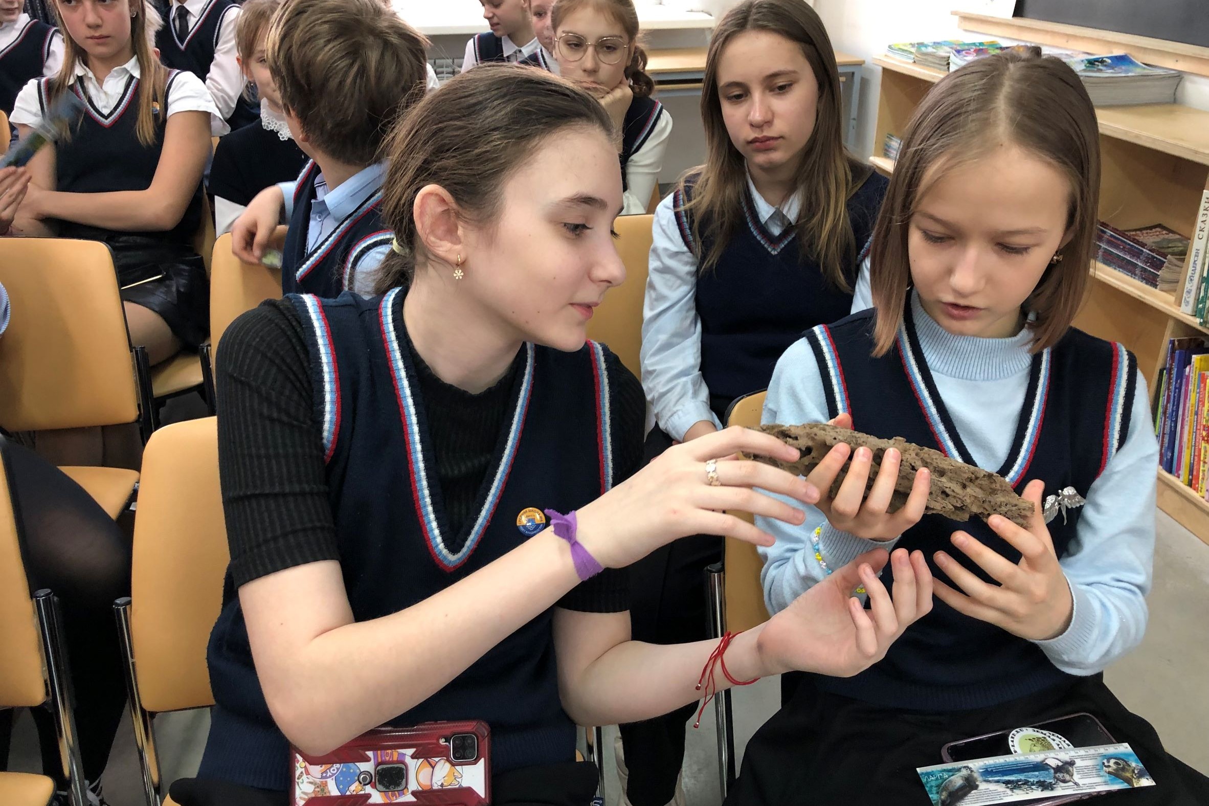 Шестиклассники, как жители морского города, много знают об обитателях подводного мира, они задавали вопросы, спорили, дополняли рассказ лектора, рассматривали и передавали друг другу необычные раковины и кораллы.