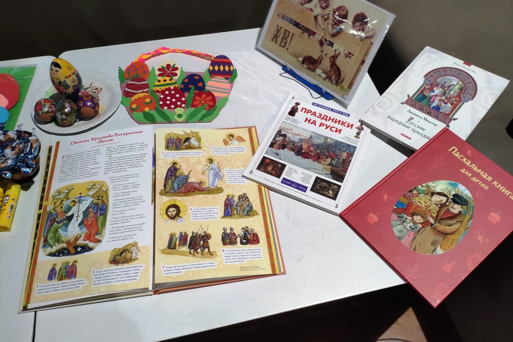 Разгадывали сканворды и филворды «Встречаем праздник», читали Пасхе красочные книги из фондов библиотек: «Пасхальная книга для детей», «Я встречаю праздник», «Рождество и Пасха в детской литературе» и другие. Большой интерес вызвало Панно «Пасхальная курочка». На нем было размещено 16 яиц, а под каждым находились вопросы о русских народных традициях, праздниках и промыслах, особенностях быта. Также вспоминались русские народные сказки и пословицы, вспоминали крылатые фразы, разгадывали ребусы).