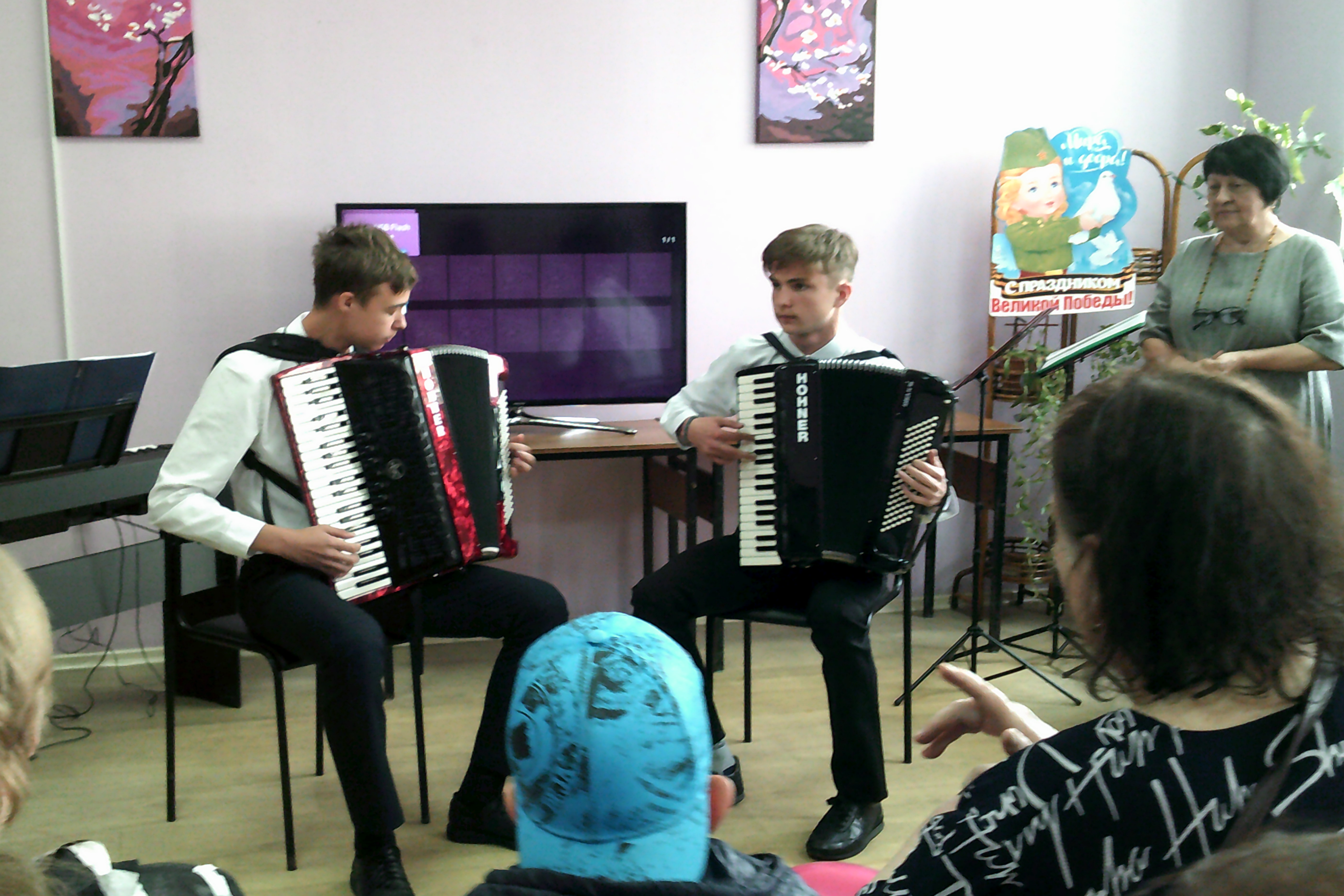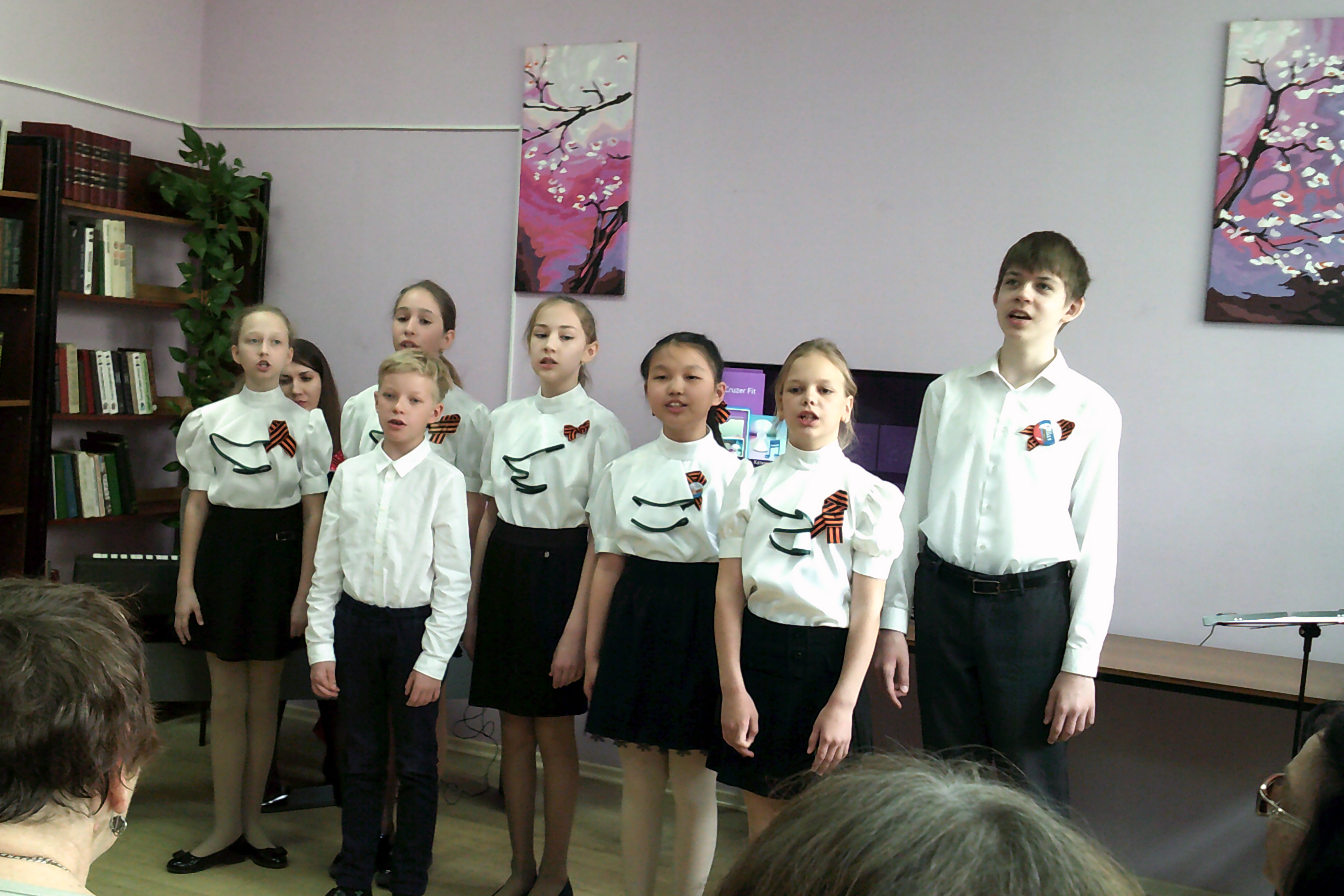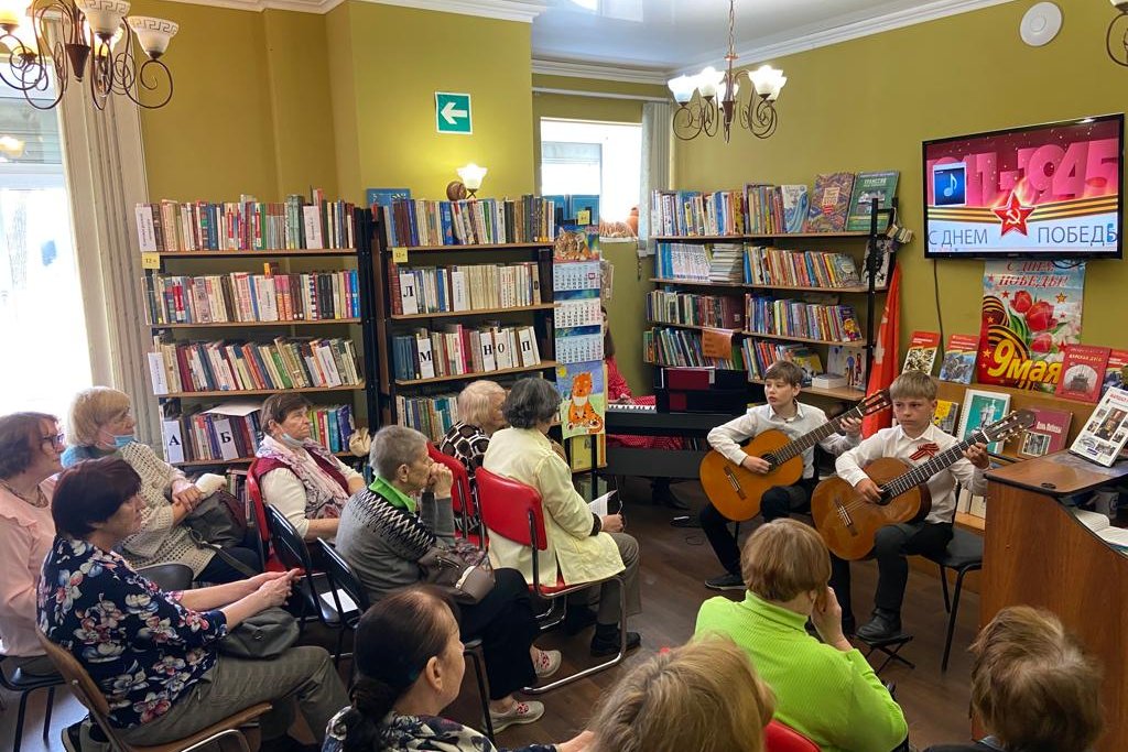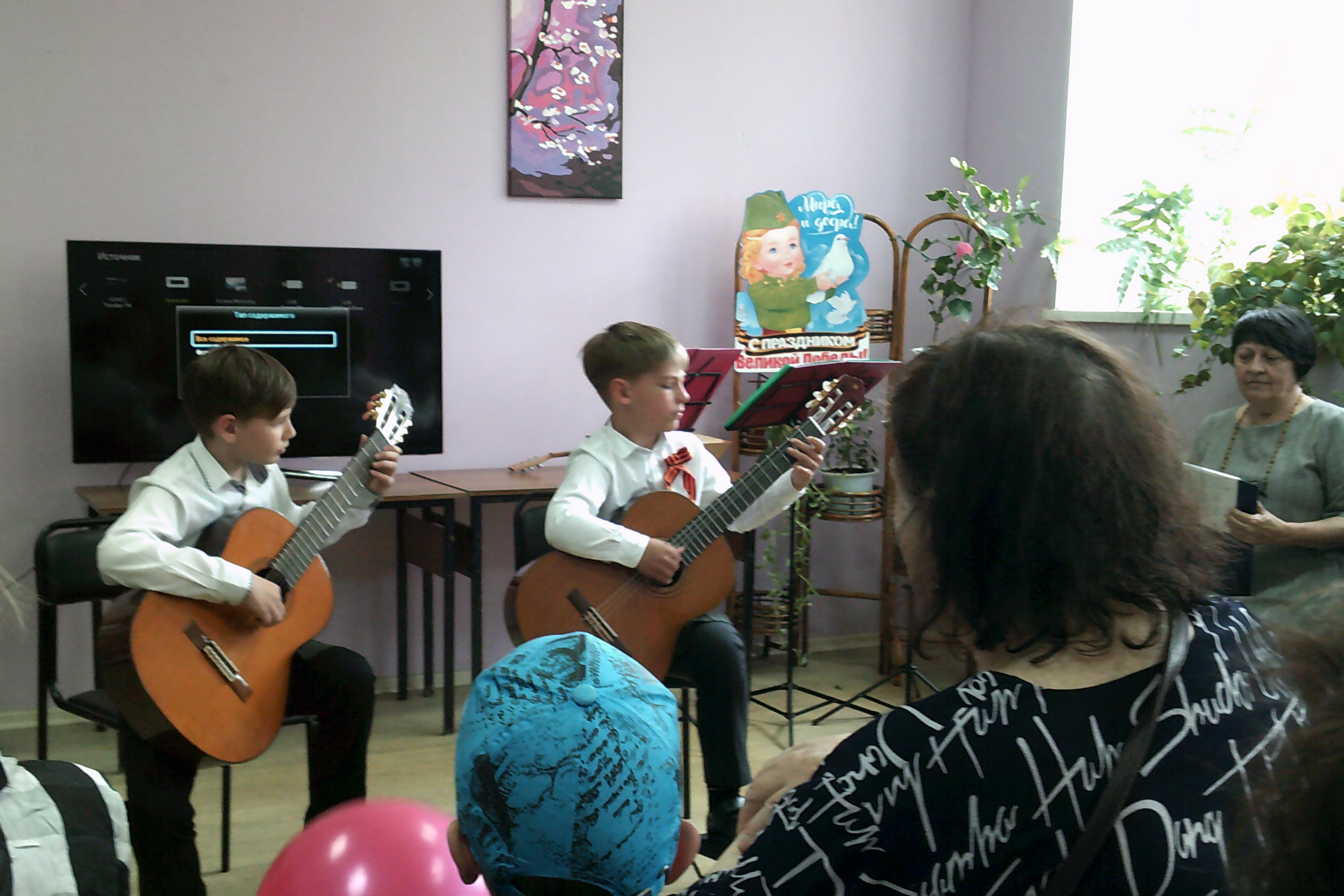 Группа гитаристов «Звездочки» исполнила попурри из военных песен и отрывки из классических произведений. Вокальная группа музыкальной школы исполнила самые известные фронтовые песни. Звучала музыка и послевоенных лет, которая была популярна на танцплощадках. Порадовали воспитанники и преподаватели и разнообразной инструментальной музыкой. Ребята закончили свое выступление исполнением знаменитой «Катюши». Гости библиотеки вспомнили о самых важных событиях Великой Отечественной, читали стихи, рассказывали личные истории, связанные с войной.
