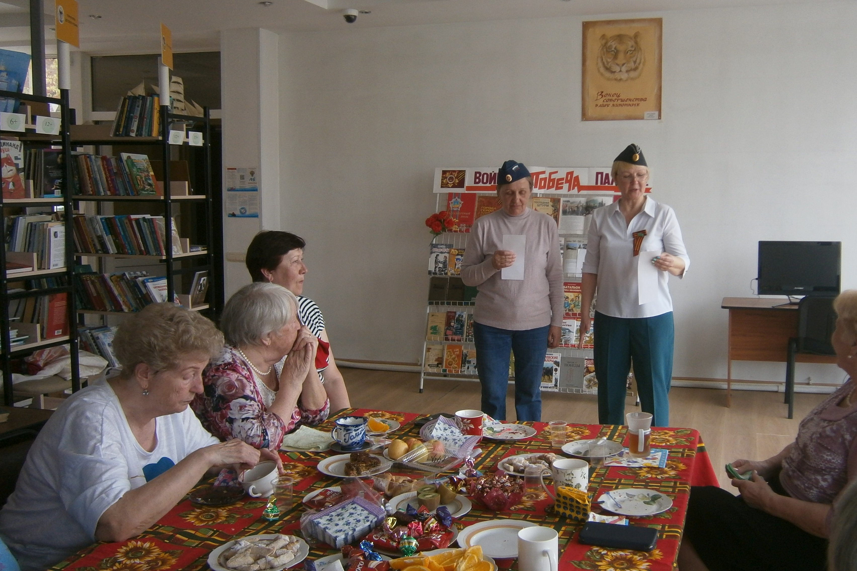 В библиотеке им. И.У. Басаргина прошёл вечер для членов клубного объединения «Исток», посвящённый Дню Победы. Оригинальный, интересный сценарий предложила и подготовила член клубного объединения «Исток» Н.Г. Раенко. И «артисты», и зрители представляли собой фронтовую агитбригаду. На встрече звучали песни, стихи. О замечательном поэте дальневосточнике Георгии Корешове посмотрели документальный фильм «Ушёл в последнюю атаку…»