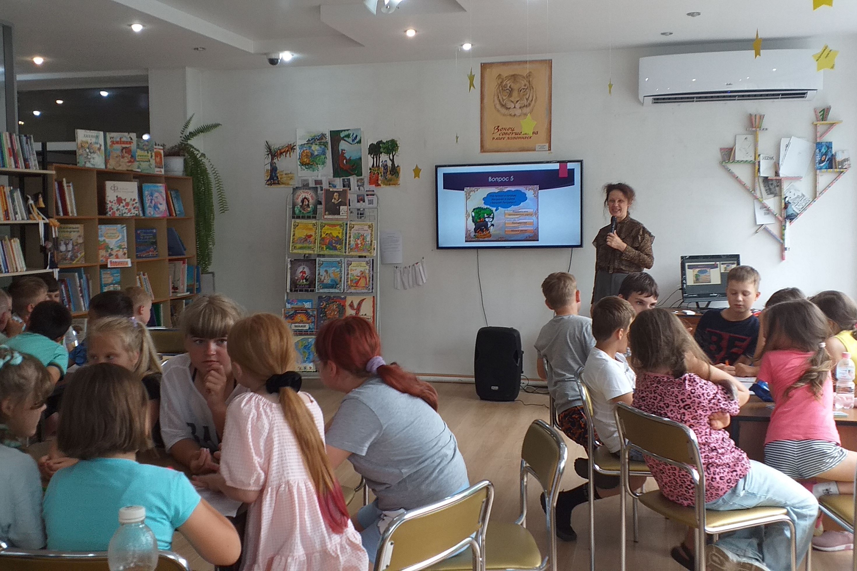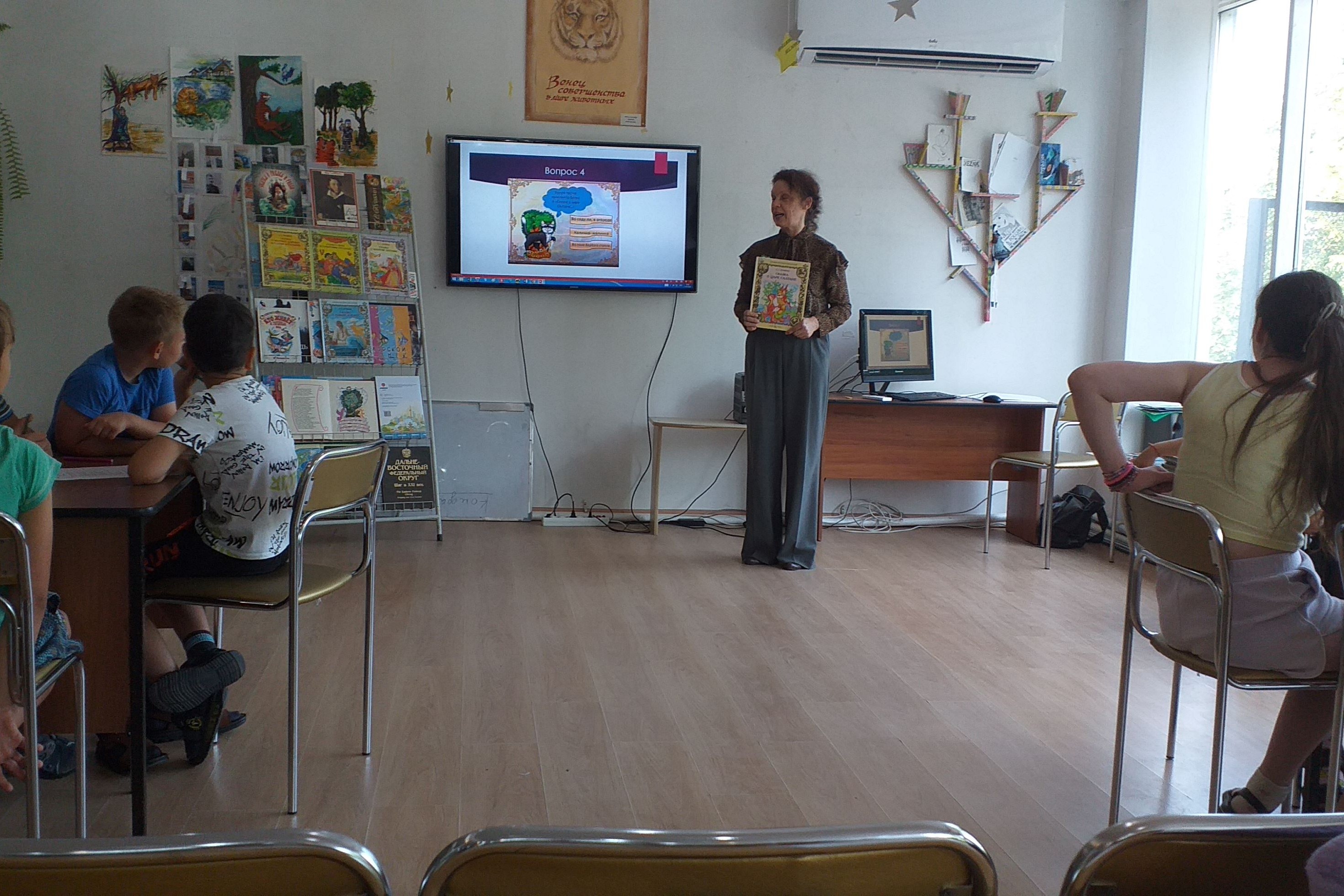 11 июля на викторину в библиотеку № 3, пришел пришкольный лагерь МБОУ СОШ № 26. Для разминки и знакомства с ребятами, были небольшие актерские упражнения на внимание, фантазию и пластическую выразительность, т.к. в этом интеллектуальном соревновании был конкурс на артистизм.