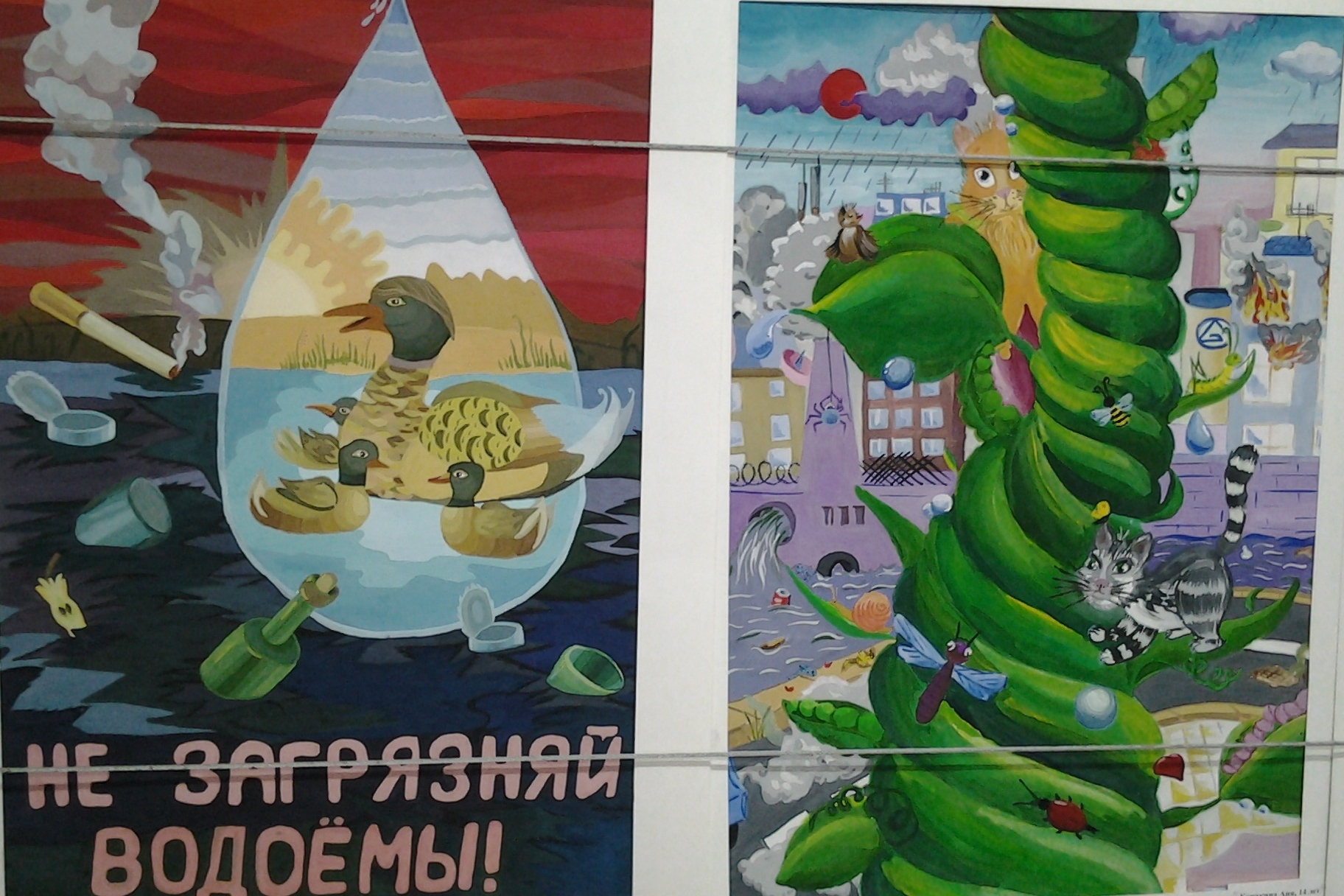 Кисточками и красками юные художники призывают людей беречь и охранять окружающий мир, ведь решение экологических проблем начинается с малого: посадить дерево, покормить зимой птиц, не разорять гнезда птиц, убирать мусор в лесу – свой и чужой. Именно это показали юные художники. По-детски непосредственно и ярко нарисованы на работе «Мы убираем вместе» персонажи: девочка, котик и мышка, наводящие порядок в лесу. Замечательной декоративной вязью изображены тигрята и их мама в рисунке «Счастливое семейство». Интересная вертикальная композиция со сложным ракурсом «Живое дерево», как символ вечной могучей природы, защищает зверей, птиц и насекомых. Различными художественными средствами ребята ярко и доступно передали образы, мысли и чувства, обратили внимания на проблемы, чтобы вместе с взрослыми подумать над их решением.