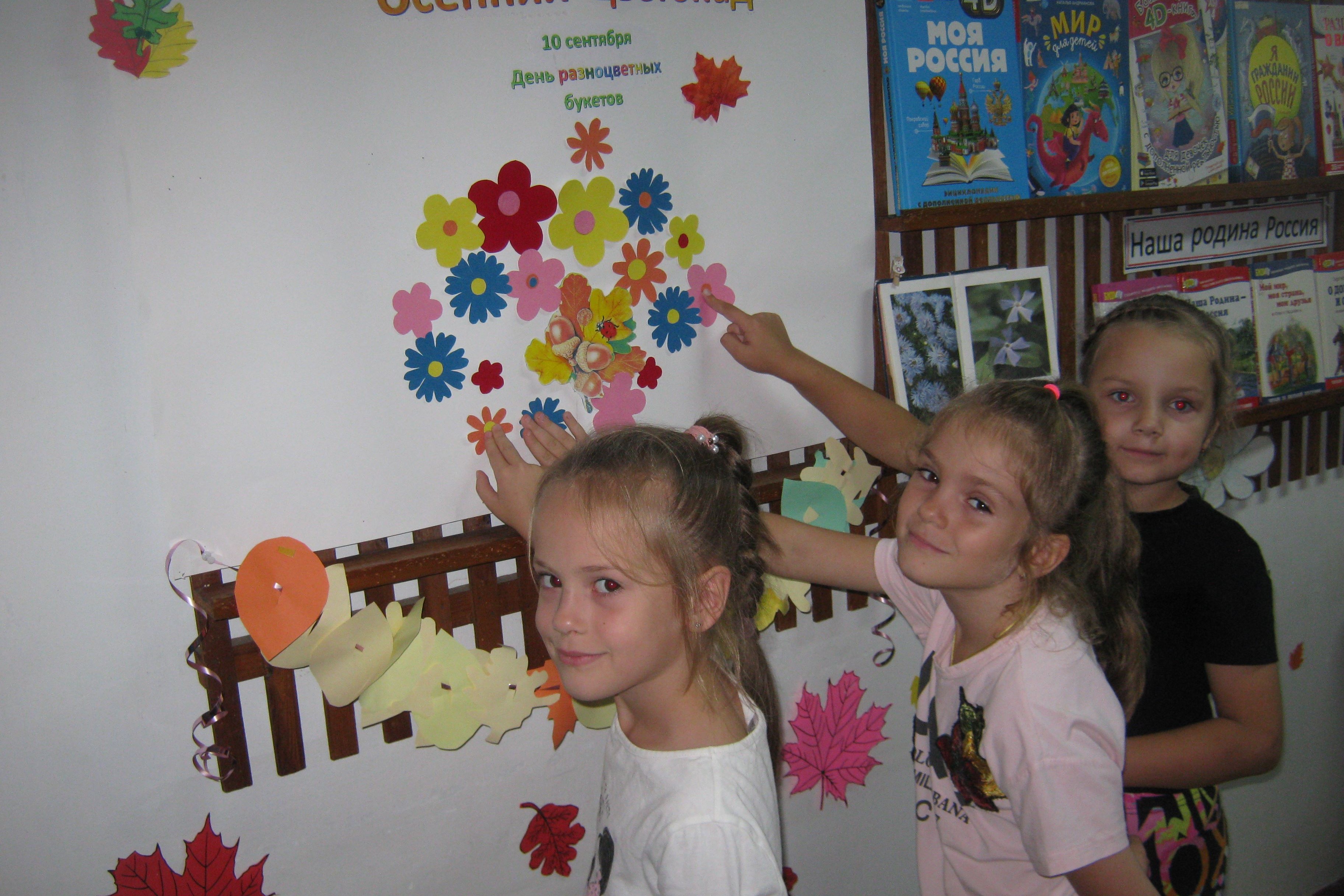 Яркое праздничное настроение дарили 10 сентября дети Д/С №173 друг другу, воспитателям и библиотекарям. Мероприятия организовано в библиотеке № 15 в честь дня осенних букетов «Осенний цветопад».