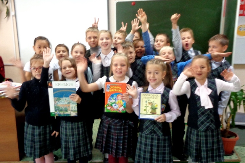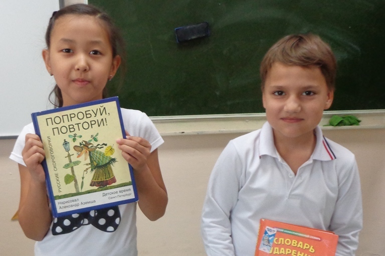 Позже школьники узнали об истории появления нашего национального языка. Оказывается, русский язык занимает шестое место в мире по числу людей, говорящих на нем. Это 260 млн. человек. И началась конкурсная программа: проводить ее библиотекарю Елене Болдиной помогли книги. Прекрасные книги для организации викторин по русскому языку, такие как сборник скороговорок «Попробуй, повтори!», «Словарь ударений», а также книга из серии «Великие художники», по ней девочки и мальчики описывали картины художника Н. П. Крымова, пытаясь выстроить связный рассказ. А еще все желающие смогли проверить свои знания орфографии, пользуясь специальными орфографическими карточками.