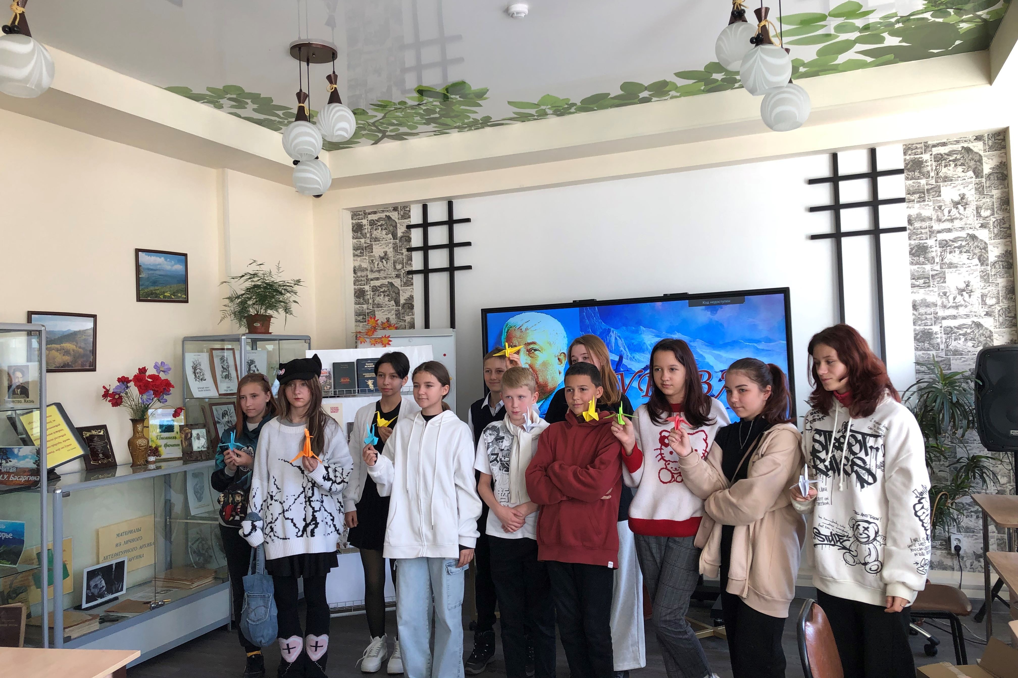 Затем школьники поучаствовали в мастер классе: вырезали бумажных журавликов под известную песню Расула Гамзатова «Журавли» (эту песню поэт написал в Японии после посещения памятника жертвам Хиросимы).