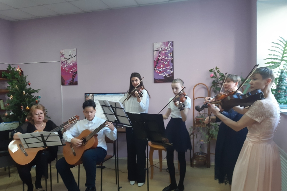 Праздничный тон задала первая композиция – всем хорошо известная Happy New Year. Интересно звучали рождественские колядки в исполнении преподавателей школы, играющих на скрипках. Далее выступал ансамбль «Музыкальная импровизация», состоявший из учащихся и преподавателей музыкальной школы: скрипачи, гитаристы в сопровождении фортепиано. Исполнялись композиции со всего света: китайская народная песня и зажигательная цыганская мелодия «Две гитары», произведения российских композиторов и современные песни. Все музыкальные произведения буквально были пронизаны духом новогодних праздников. Особенно трогательны были выступления юных скрипачек Довбыш Марии, Чудиновой Миланы и Светланы Михеевой. В заключительной части концерта прозвучали такие жизнеутверждающие произведения как новогодняя песня «Холли Долли», Feliz Navidad, «Увезу тебя я в тундру» группы «Самоцветы», регтайм Скотта Джоплина.