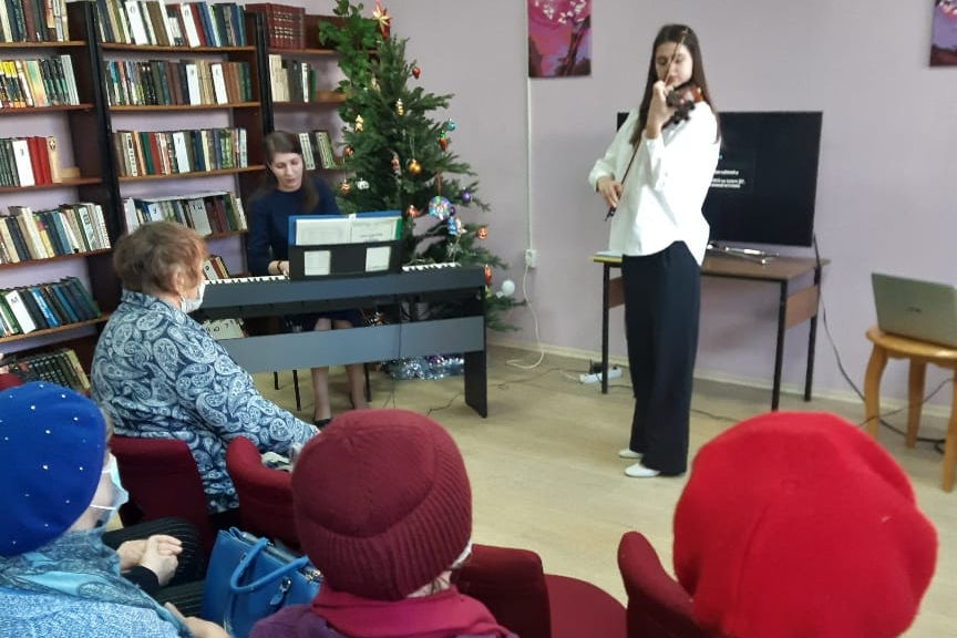 Праздничный концерт организован для читателей 60+ в библиотеке № 13, и посвящен Рождеству и Старому новому году. Перед пенсионерами и инвалидами выступила концертная бригада детской музыкальной школы № 8 им. А.В. Воробьёва.