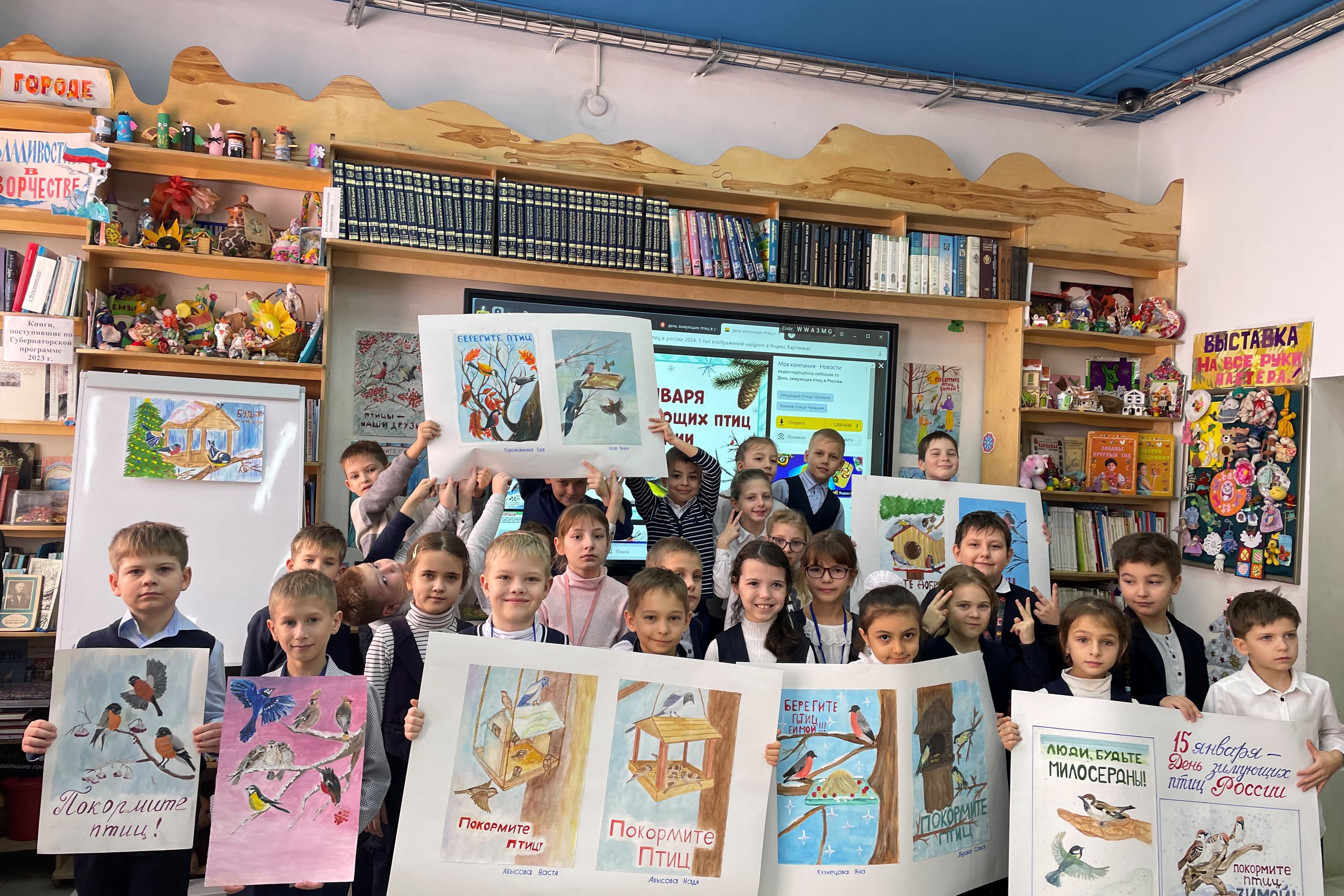 17 января в библиотеке побывали ученики 2 «Б» класса школы № 74, которые с интересом рассматривали работы учащихся. В ходе интересной беседы дети узнали, какие птицы зимуют в нашем крае, говорили о том, что птицы зимой погибают не столько из-за холода, сколько из-за голода. Тогда на помощь животным приходят люди – они устраивают кормушки. Птицы будут есть злаки, семена подсолнечника, несоленое сало, мясо, творог, сушеные ягоды. Дети говорили о том, что они могут помочь и помогают птицам – многие подвесили за своим окном кормушку, подкармливают птиц зимой в парках и скверах. Дети сфотографировались с плакатами и призывают всех неравнодушных: «Покормите птиц зимой!».