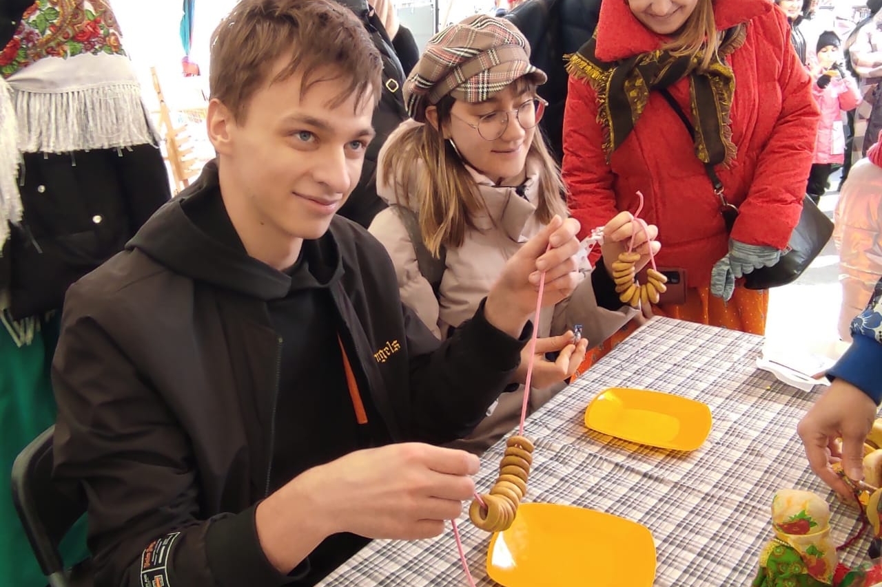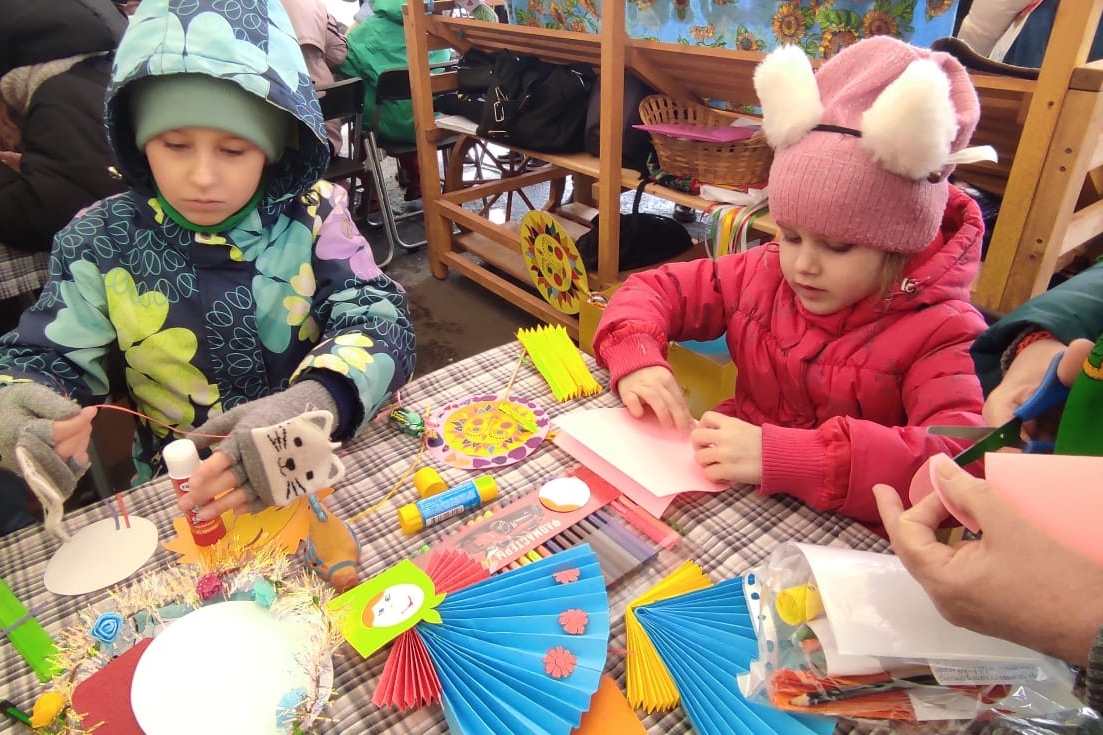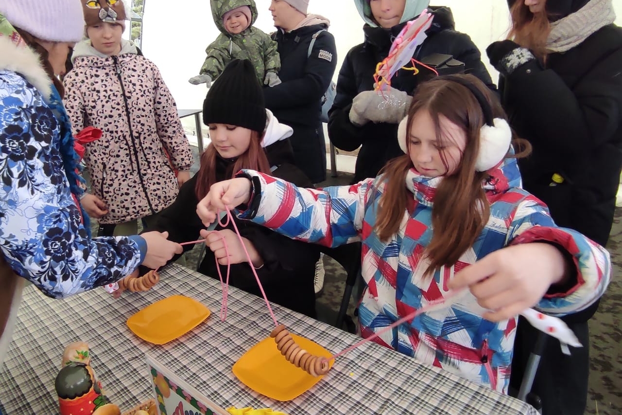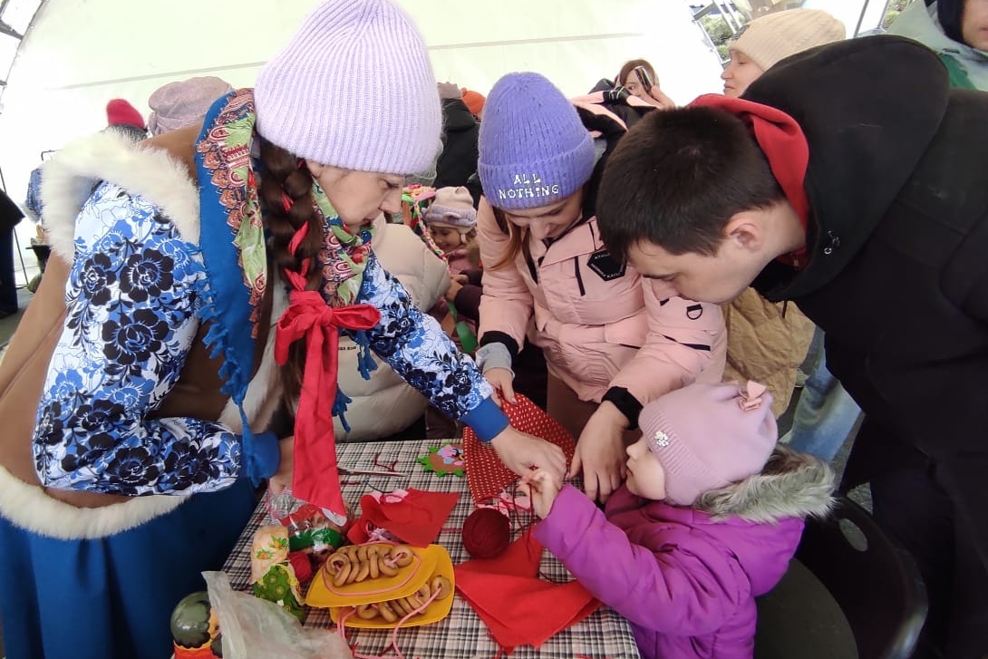 А еще много желающих было сделать маленькую тряпичную куколку, и тут не только дети, но и мамы активно включались в творческий процесс. Потом соревновались в быстром нанизывании настоящих бубликов на веревочку. Это веселое состязание требовало сосредоточенности и терпения. Детишки соревновались между собой, а потом мамы соревновались с папами. Победители получали в награду вкусную баранку.