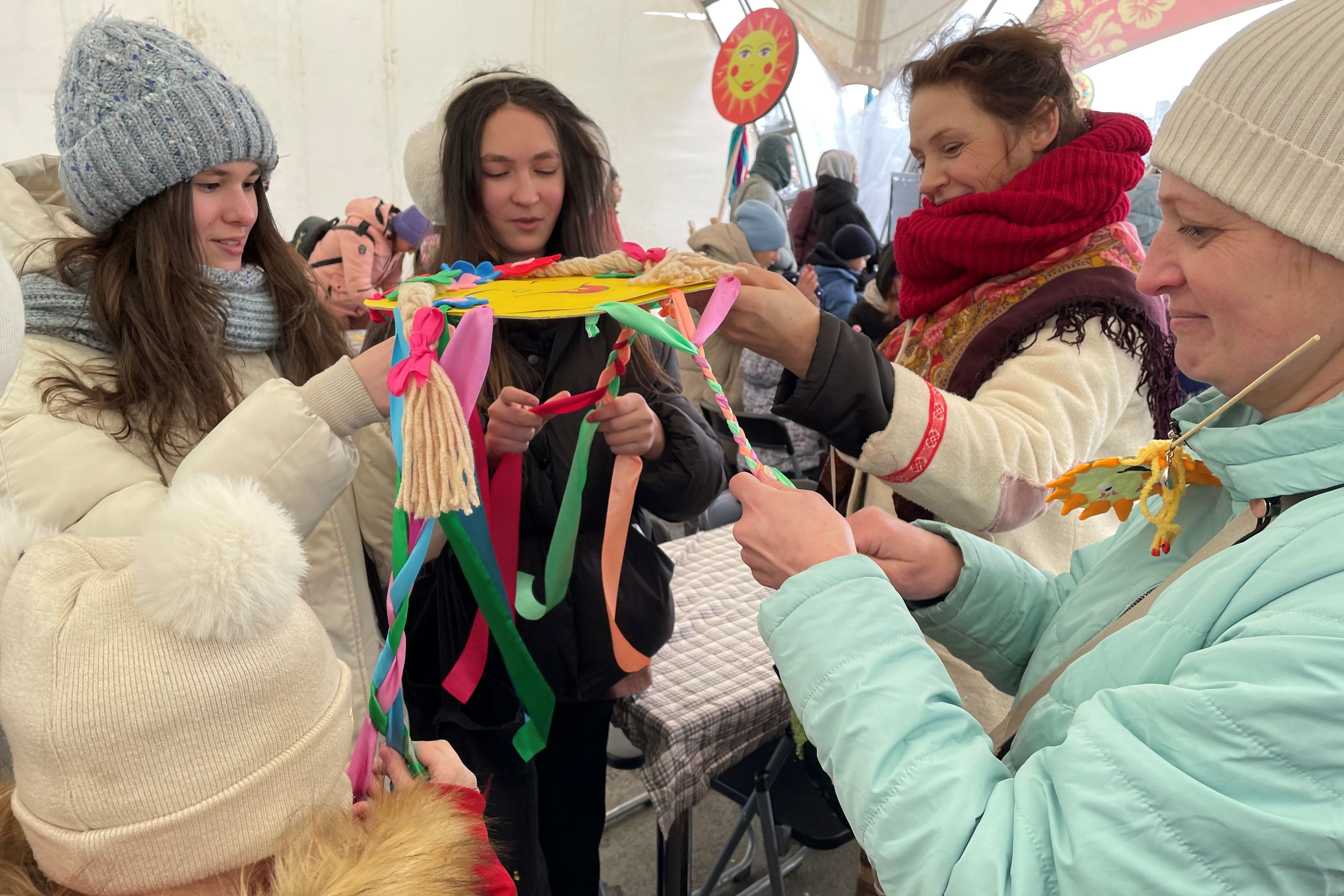 Много восторга вызвало плетение кос из разноцветных лент, особенно на скорость заплетания! Кто не умел плести косы, на ходу учились это делать. Даже молодые люди под присмотром девушек, с которыми, вероятно, вместе учатся, учились заплетать косы, чем потом очень гордились. Бабушки плели косы вместе с внуками и внучками, мамы соревновались с дочерьми, даже папы помогали своим девочкам. А как понравилось заплетать косы иностранным девушкам, которых на празднике тоже было немало. Они по-русски благодарили за такое веселое времяпровождение.