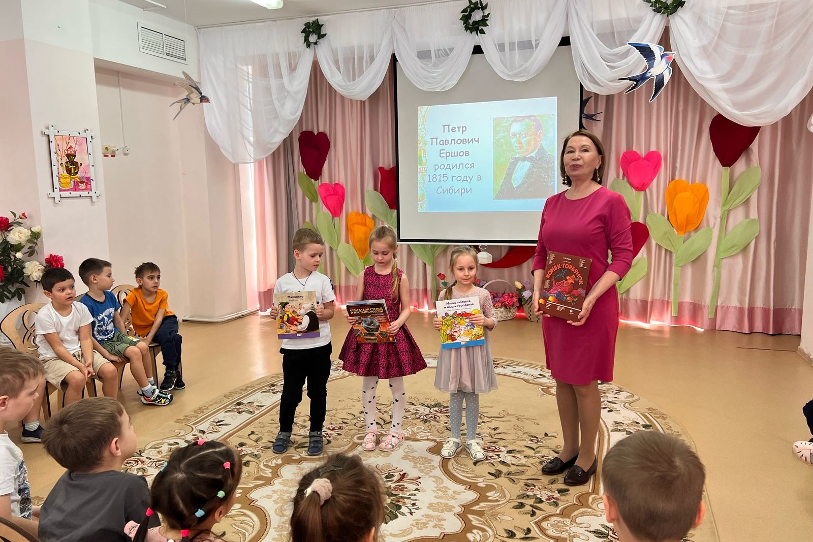14 марта в честь юбилея писателя библиотекой №13 для воспитанников детского сада № 41 был организован литературный час. Мероприятие началось с увлекательного рассказа ведущей о биографии Петра Ершова. Ведущий акцентировала внимание на том, как важен был непосредственный контакт будущего писателя с носителями устного народного творчества, как они прививали Ершову любовь к слову, чувство ритма и неповторимый стиль народного повествования. Кульминацией мероприятия стала увлекательная викторина по сказке. Ведущая пригласила всех воспитанников посетить библиотеку, на что дети дружно захотели прийти за новыми книжными сокровищами.