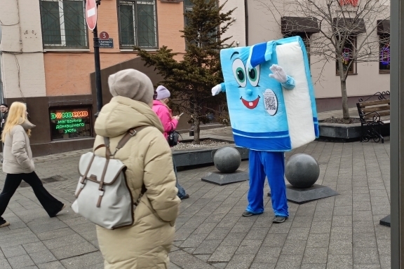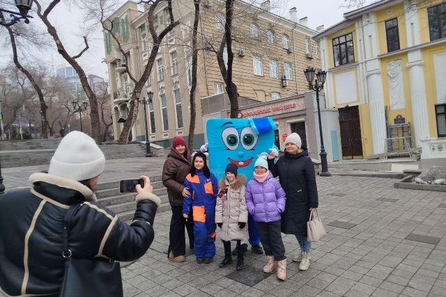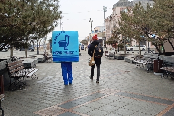 Четырнадцатого марта сотрудники библиотеки №10 (ул. Верхнепортовая, 76) вместе с мягкой ростовой куклой «Книжкой» прошлись по центральным улицам Владивостока.