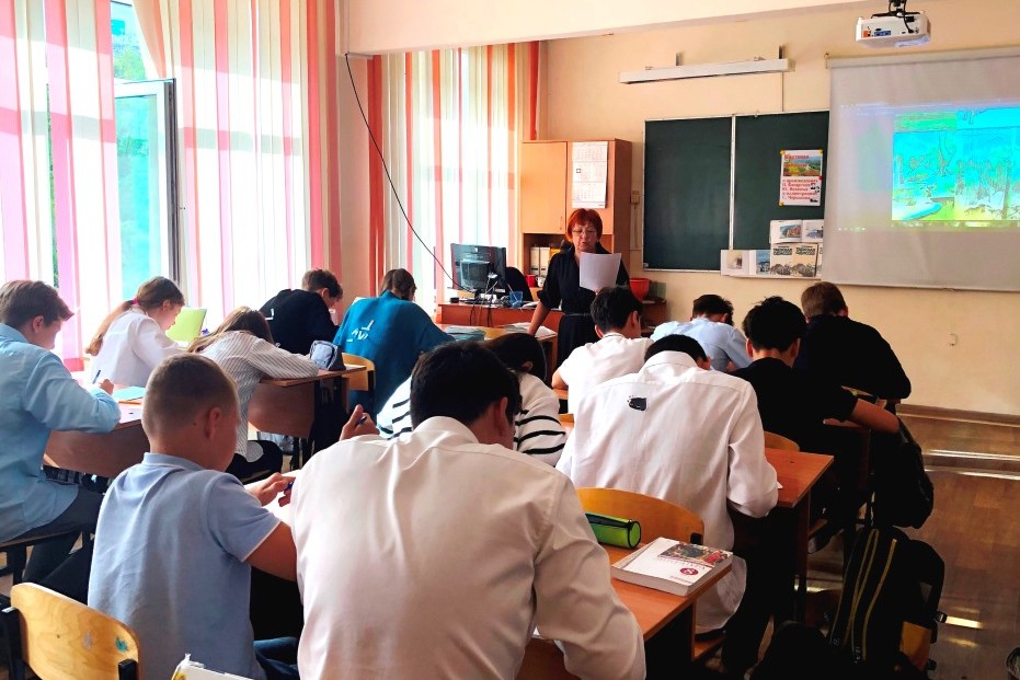 После чтения небольших по объёму отрывков из рассказов и новеллы И.У. Басаргина, повести Ю.В. Вознюка, дающих развёрнутый образ тайги в разные сезоны года – от лета до глубокой зимы, школьники написали диктант (текст прочитала педагог Т.П. Климова), а затем провели морфологический разбор двух причастий из текста диктанта, подчеркнули определения.