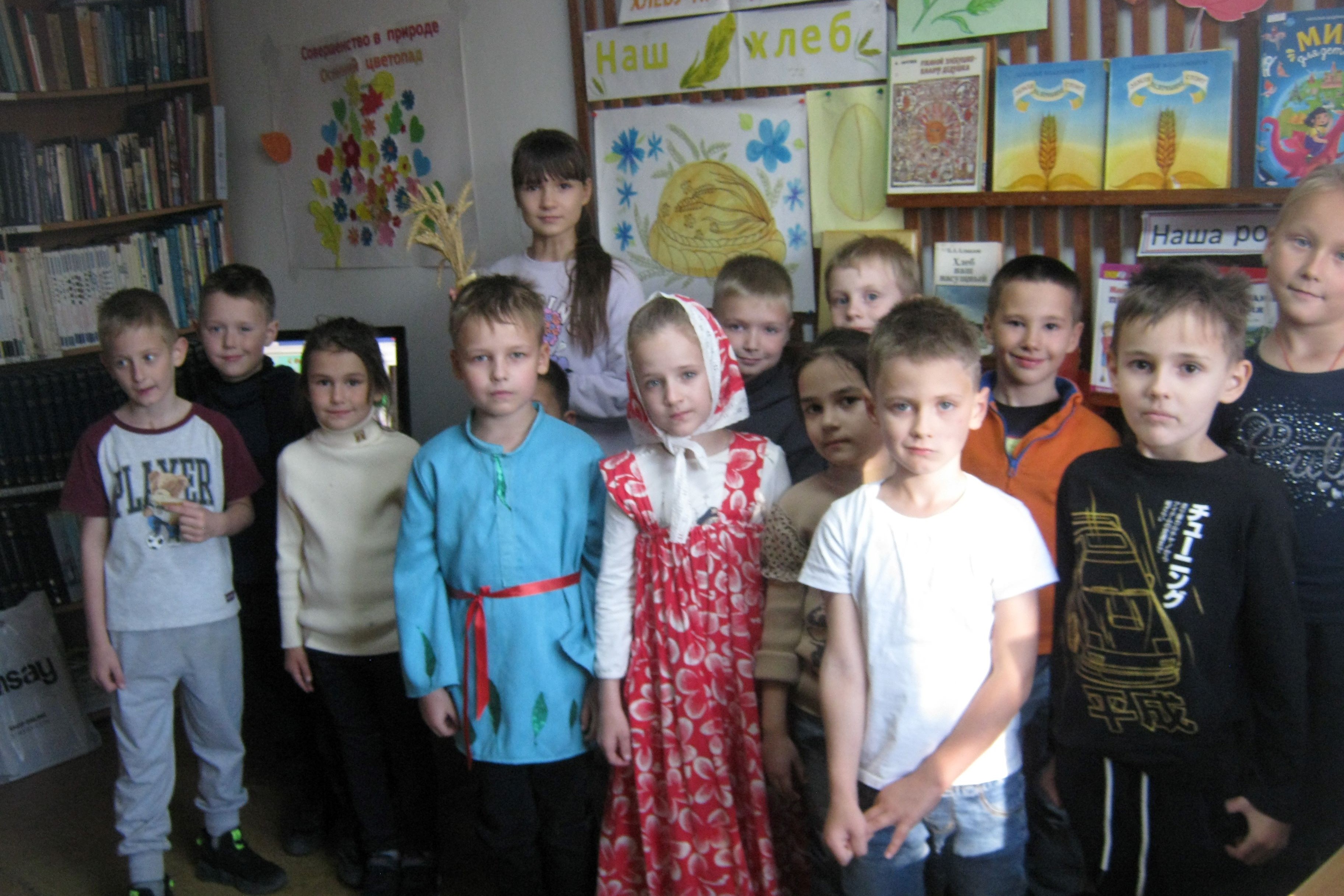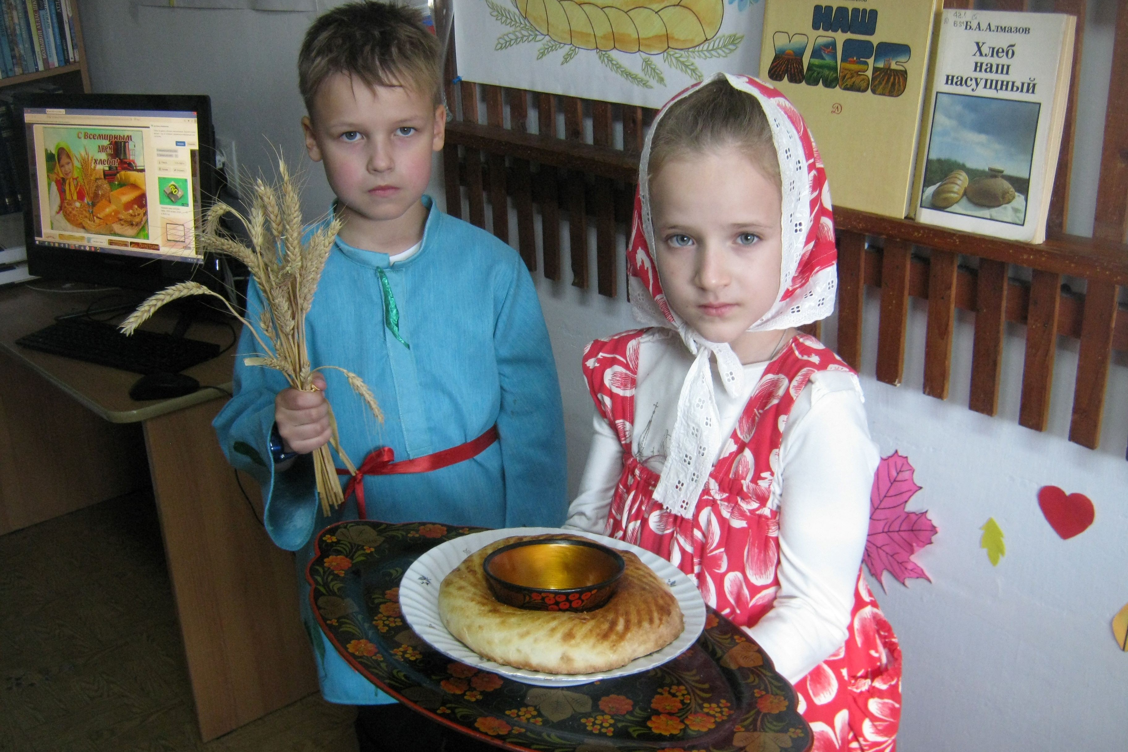 В этот день в библиотеках дети младшего возраста стали участниками познавательных мероприятий и фольклорных праздников. Библиотека №15 провела познавательную беседу с элементами фольклорного атрибута «В начале было зернышко». Участниками мероприятия были ребята студии «Дай пять». Детям рассказали о том, что на Руси издревле к хлебу относились с великим почтением и любовью. Малые дети ласково называли кусочек хлеба – папа, старики кланялись ниве в пояс, молодежь плела венки из ржи и цветов васильков, спутников ржи, венки, водили хороводы и из первых колосьев варили кашу — кутью. Много пословиц и поговорок придумал народ о хлебе «Худ обед, когда хлеба нет», «Хлеб да вода – богатырская еда.