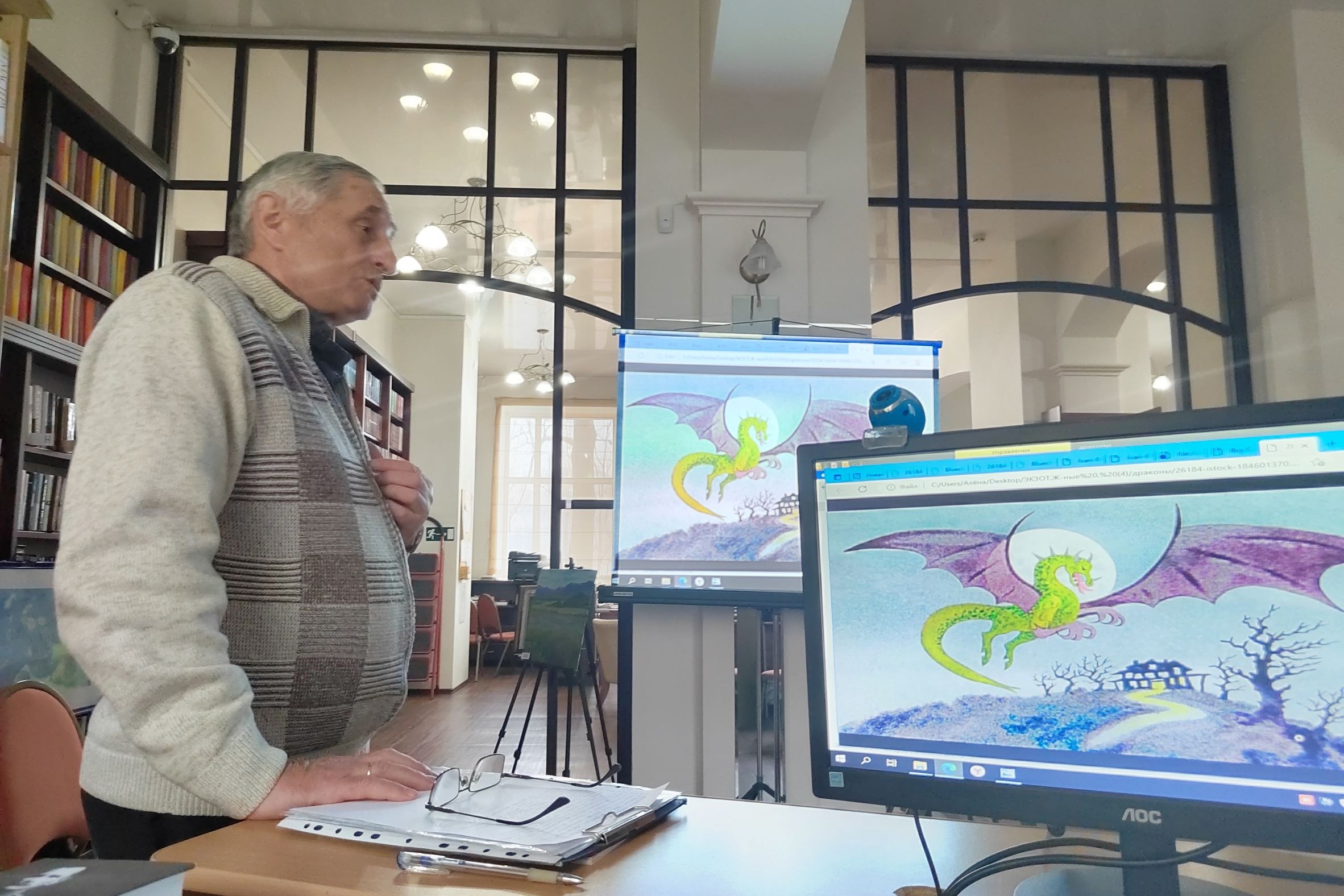 Также Вера Измайлова немного рассказала о мифическое животном, известном как Чупакабра, которое фигурирует в рассказах, картинках. Включение в разговор рассказа о бабре было запланировано ранее – с тех пор, как писатели рассказали в библиотеке о своей поездке в Монголию, на пути туда они проезжали Иркутск, конечно же. Так, в Монголии Вера и Александр побывали в парке динозавров, где воссозданы динозавры в натуральную величину. Но как отметил Александр, если драконы – это всё же ископаемые животные, эти крупные рептилии были хозяевами планеты в течение 150 миллионов лет, а затем уступили место млекопитающим. То драконы – это всё же мифические животные, фигуры которых отмечались во многих культурах. Так, есть мнение, что драконов не существует, но придумать их человечеству было необходимо. Конечно же, сначала вспомнили о сказочном персонаже русских сказок – трёхголовом Змее Горыныче. Красный дракон был старинным символом Уэльса в Англии. По преданию, его поместил на своё знамя король Кадваладр – как считалось, предок Тюдоров. В 1959 году был официально утверждён флаг Уэльса: красный дракон на бело-зелёном поле, как на боевом знамени Генриха Тюдора.