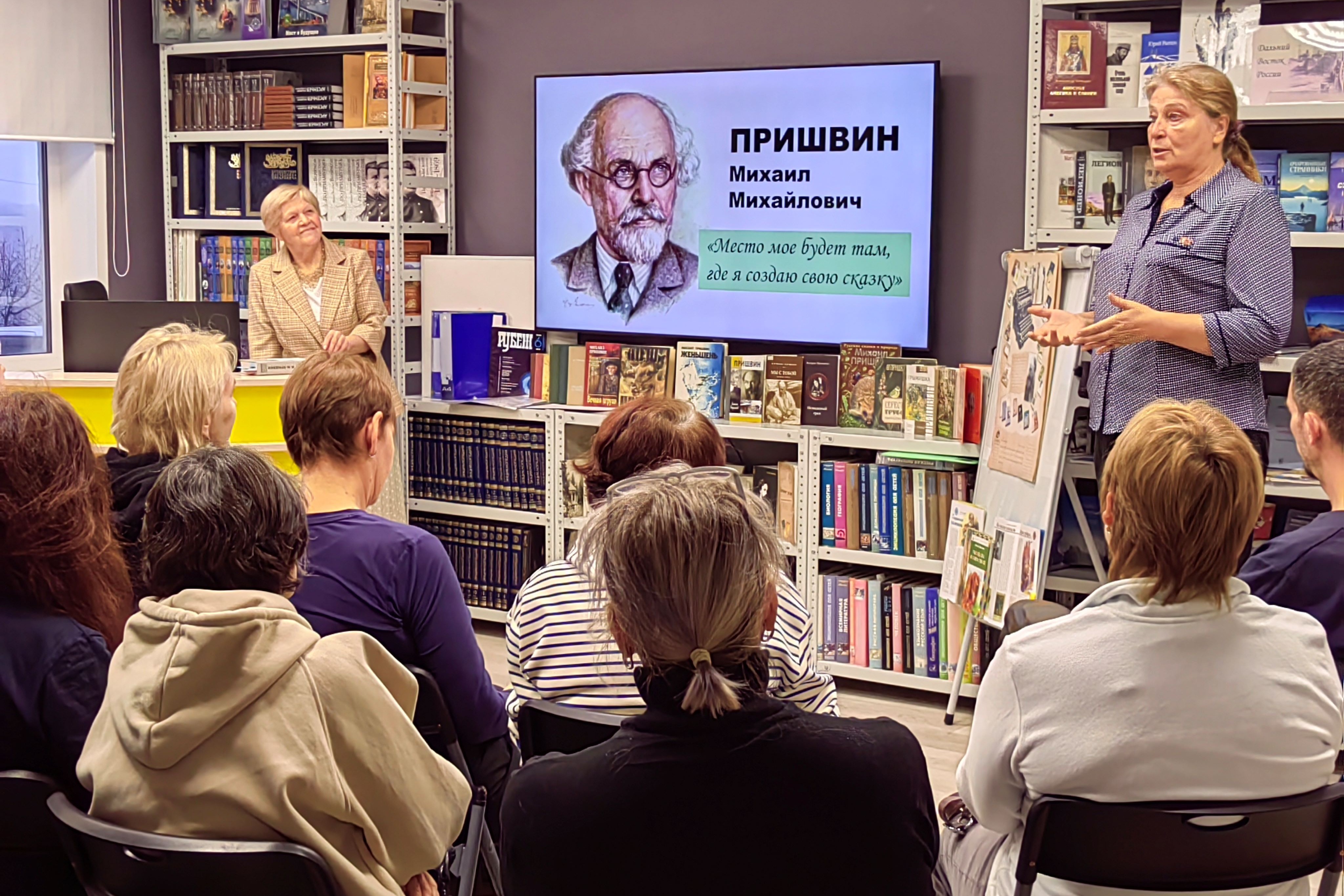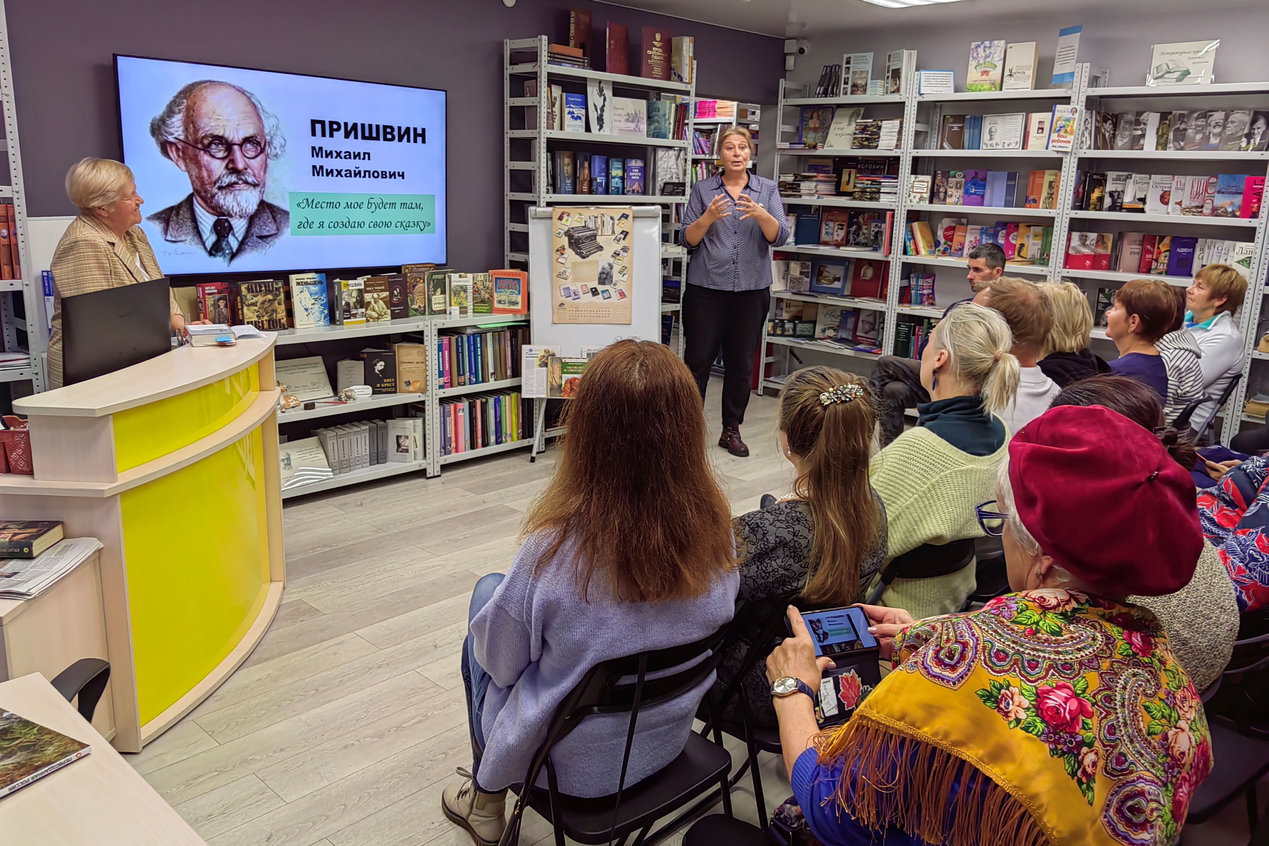 Многие присутствующие только начинали свое знакомство с автором. Автором, который писал и для взрослых, и для детей, и вел свои ежедневные записи-дневники. Поэтому сотрудник библиотеки подробно ознакомила их с биографией и творчеством М.М. Пришвина. Основным же блоком встречи был приезд писателя в Приморский край.