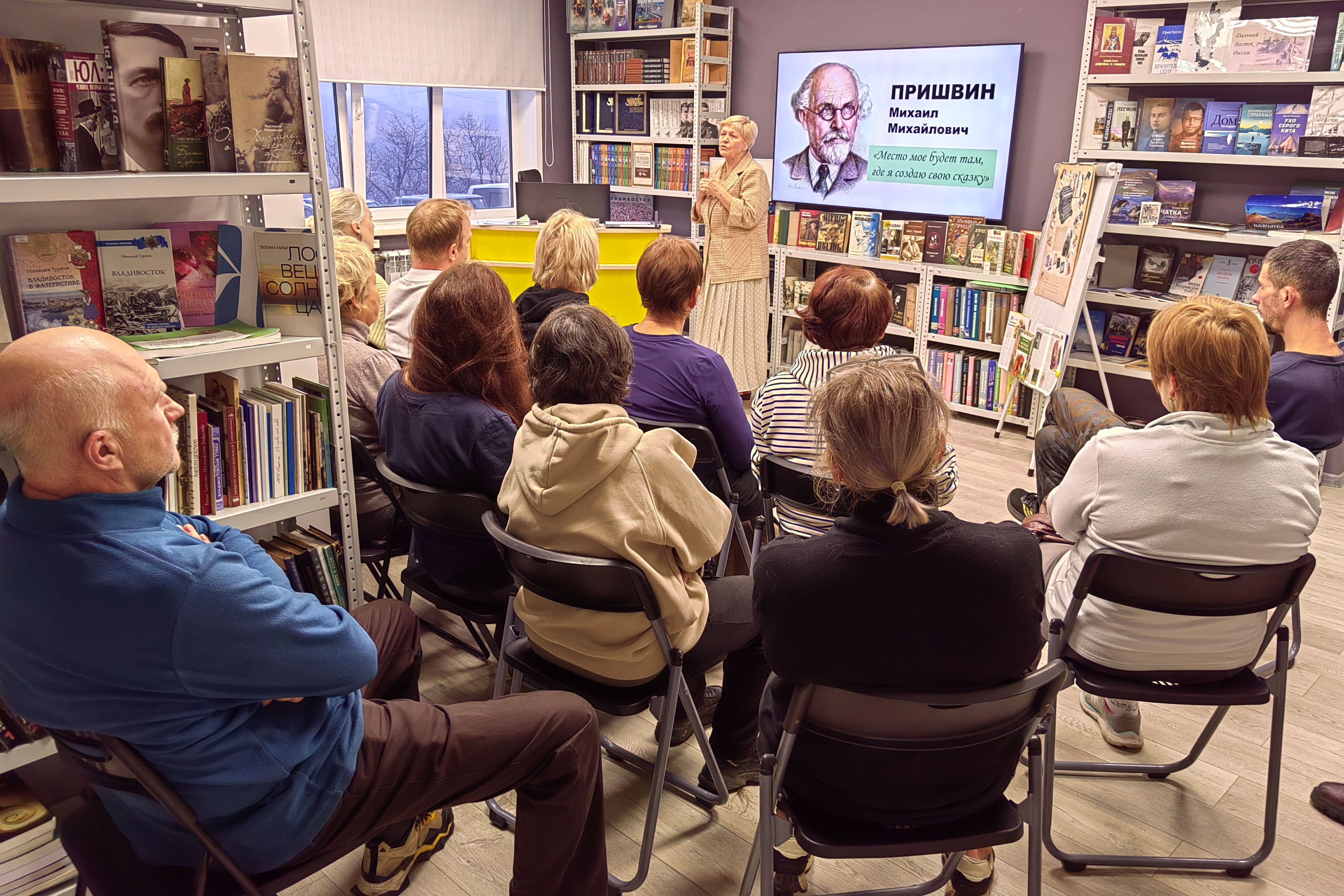 Многие присутствующие только начинали свое знакомство с автором. Автором, который писал и для взрослых, и для детей, и вел свои ежедневные записи-дневники. Поэтому сотрудник библиотеки подробно ознакомила их с биографией и творчеством М.М. Пришвина. Основным же блоком встречи был приезд писателя в Приморский край.