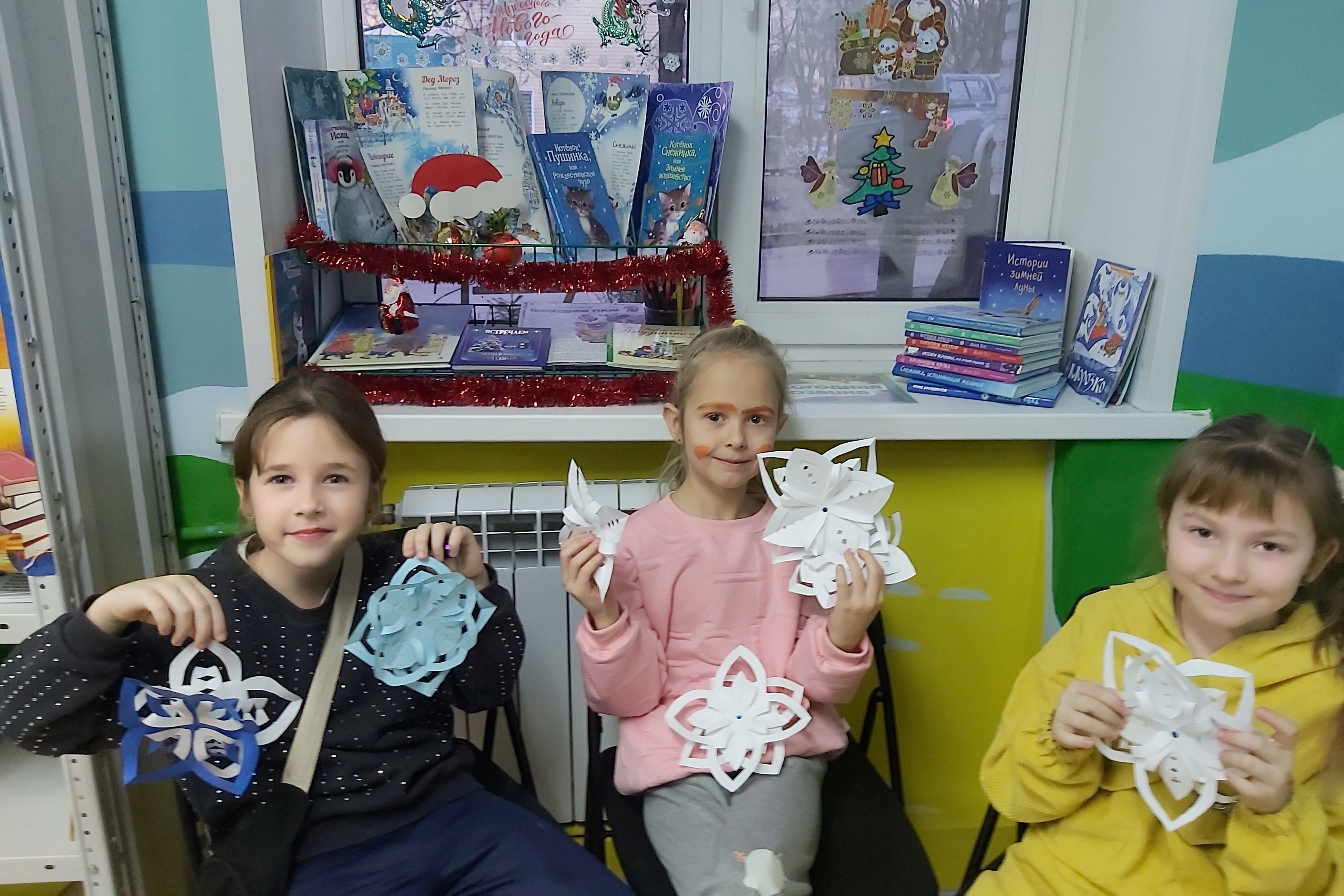 А неделей ранее здесь проходила творческая мастерская по изготовлению объемных снежинок «Волшебная снежинка». В начале мероприятия дети узнали об истории создания бумажной снежинки. Библиотекарь рассказала, как, для чего и чем украшали ёлку наши предки. Для того чтобы сделать красавицу снежинку, детям раздали листы белой и синей бумаги, клей, ножницы. Приложив немного фантазии и умения, ребята совершали чудо — простой лист бумаги превратили в чудесную снежинку, которая завораживает, притягивает взгляд, ей хочется любоваться.