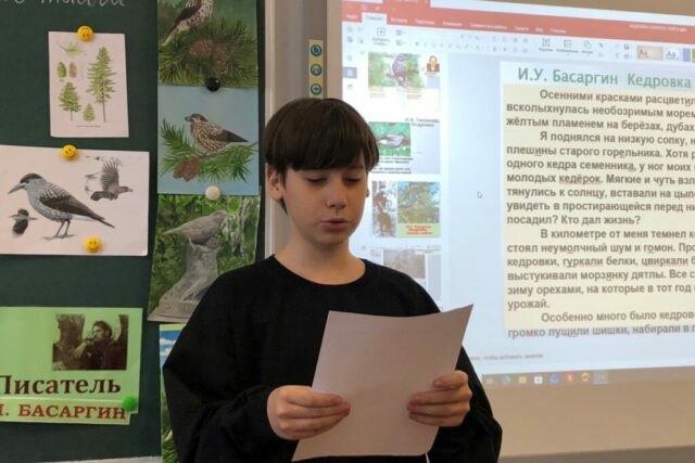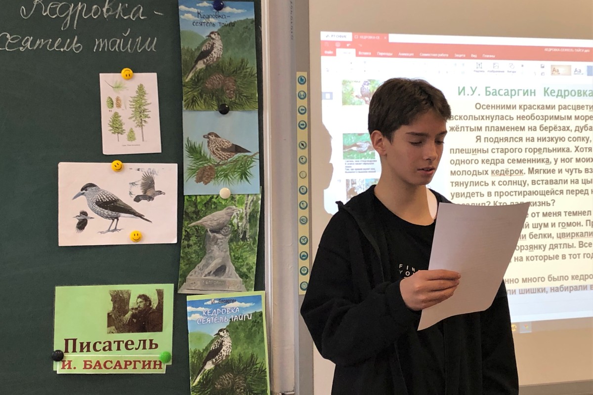 После просмотра презентации, в которой были представлены сведения об авторе рассказа и яркий, познавательный материал о кедровке — птице, которую называют «таёжным лесоводом» за то, что эти птицы являются массовыми распространителями кедра (сосны сибирской и корейской), прочитали стихотворения о кедровке, а затем перешли к работе с текстом рассказа «Кедровка — сеятель тайги». Прочитали это небольшое по объёму произведение с динамичным сюжетом вслух с комментариями и обсуждением прочитанного, обратив внимание на ряд деталей текста и расстановку смысловых акцентов. Ребята заинтересованно слушали, поняли прочитанное и активно отвечали на вопросы.