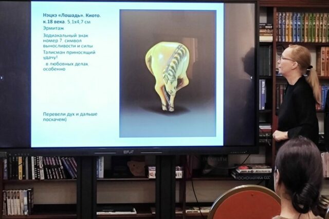 На встрече директор выставочных залов ВВГУ Надежда Сухарева рассказала об истории коллекционирования и экспонирования восточной мелкой пластики в России в прошлом и в настоящем. А также напомнила слушателям, какие ключевые выставки, посвященные этой теме, проходили в нашей стране в последнее время.