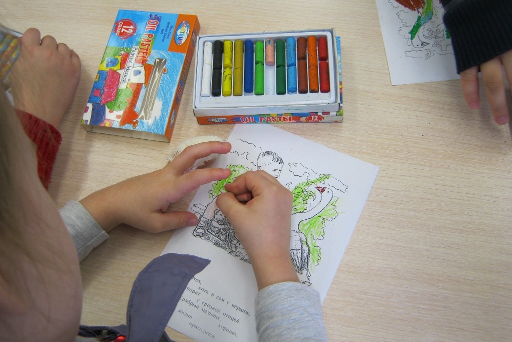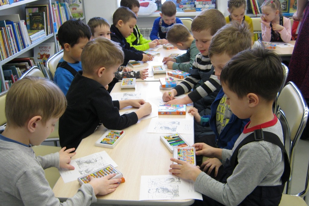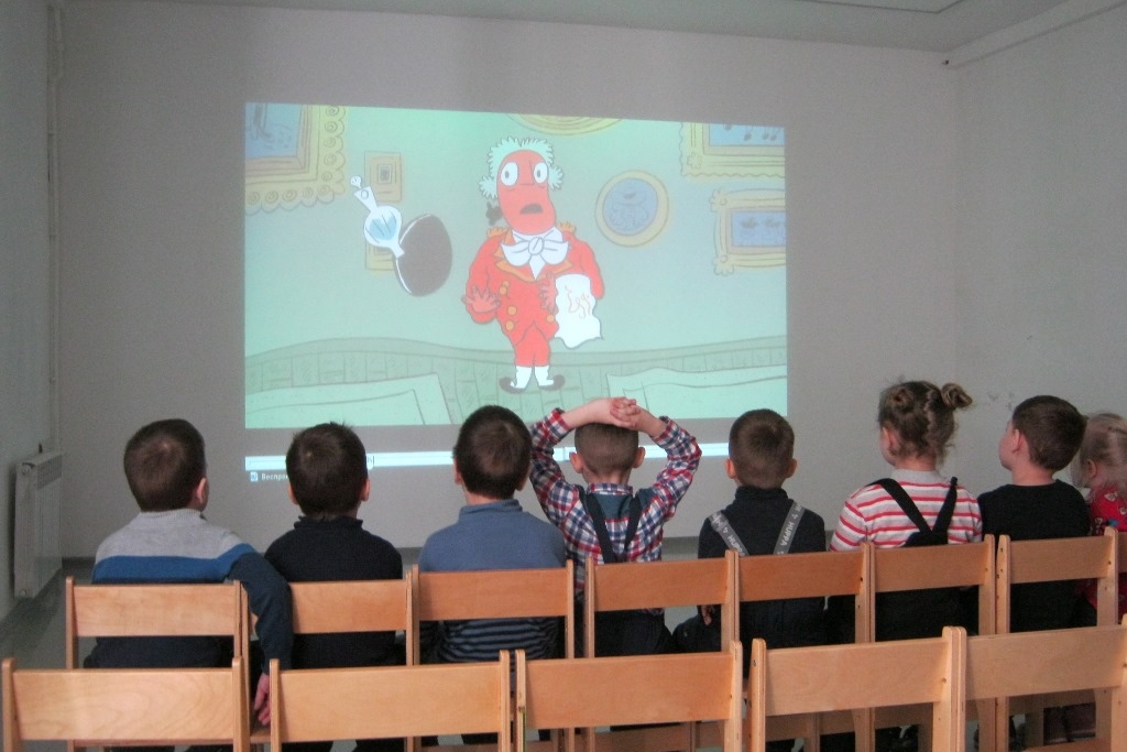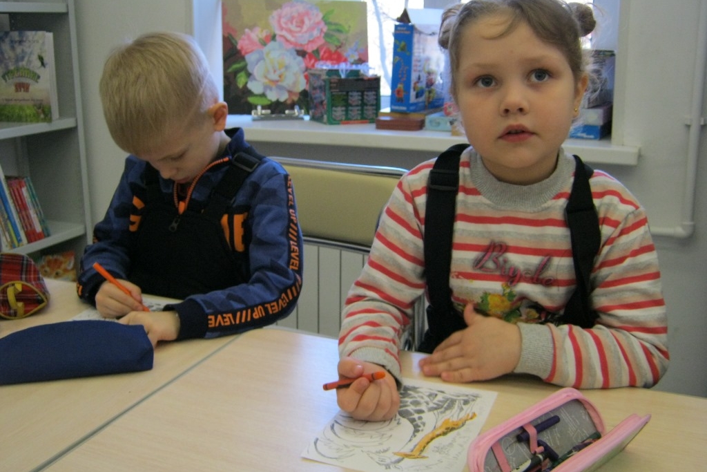 Как обычно, во второй половине занятия детсадовцы достали свои наборы карандашей и раскрасили иллюстрации Ю. Коровина и А. Пахомова к детским стихотворениям Маяковского. А потом посмотрели анимацию про неряшливое «Страшилище — хорошилище» и Джека-простака, который все делал не так.