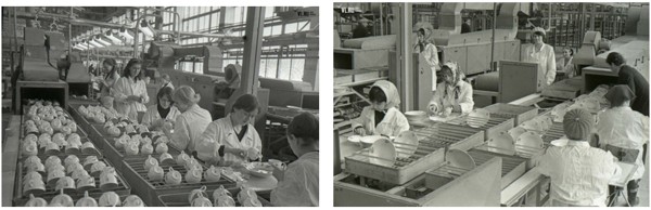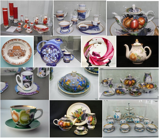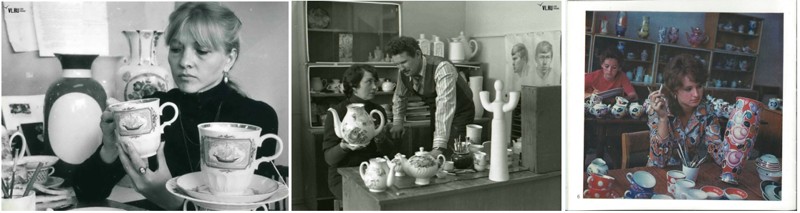 Для декорирования посуды на заводе применялись различные технологии: ленты, отводки золотом, штамп, печать через сетку, деколь и живопись.