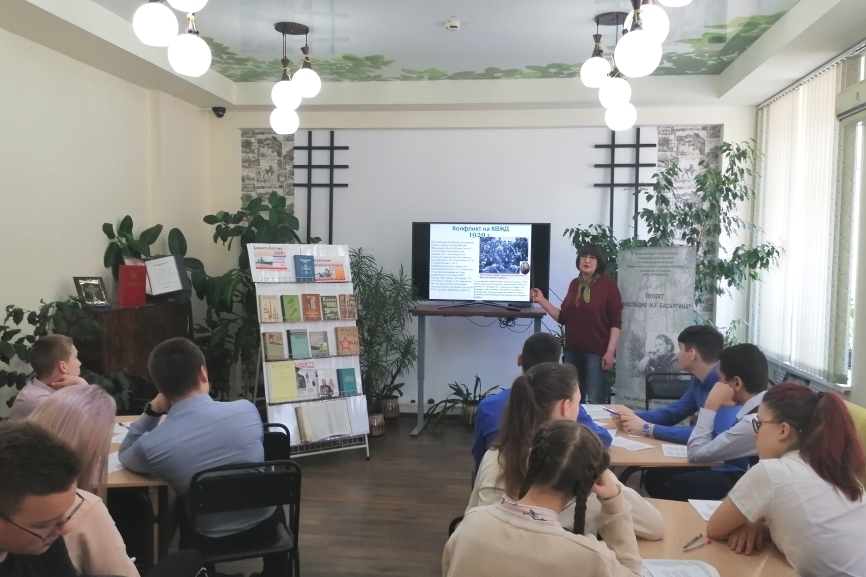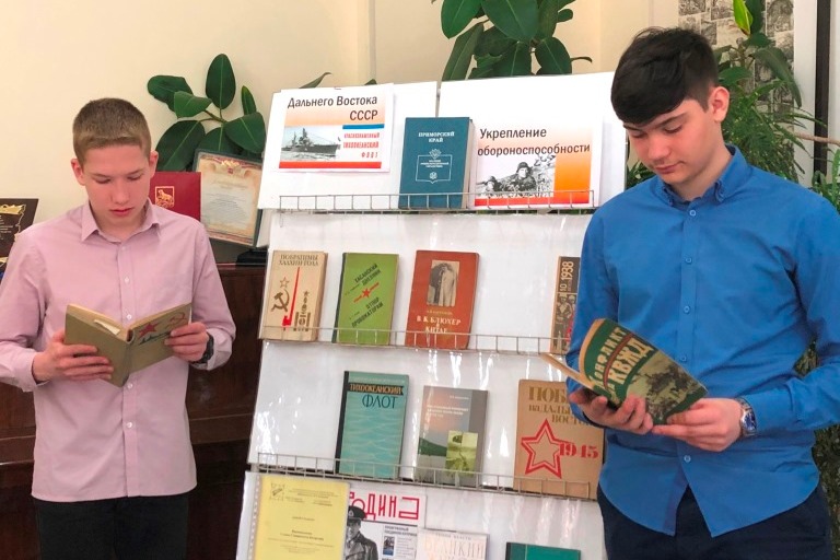 Беседу с просмотром презентации об усилении обороноспособности Дальнего Востока предварил анализ страниц исторической летописи Советских Вооруженных Сил о конфликте на КВЖД и создании Особой Дальневосточной армии (позже ОКДВА). Внимание учащихся было обращено на то, что в фонде библиотеки есть книга «Конфликт на КВЖД: Из истории Советских Вооруженных Сил», издание которой было предпринято Хабаровским издательством к 60-летию событий. Осложнение военно-политической обстановки на дальневосточных границах СССР в 30-е годы ХХ века потребовало наращивания группировки военно-воздушных и военно-морских сил, усиление охраны границ. Внутриполитическая ситуация характеризовалась усилением репрессий среди разных слоев населения. По данному вопросу были приведены примеры из материалов литературного архива И.У. Басаргина.