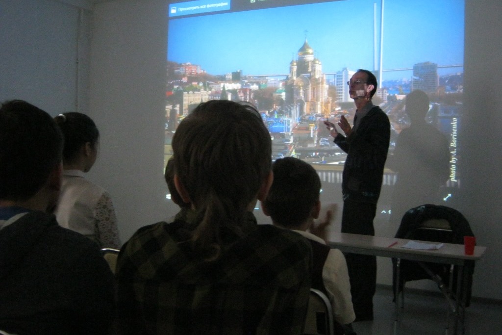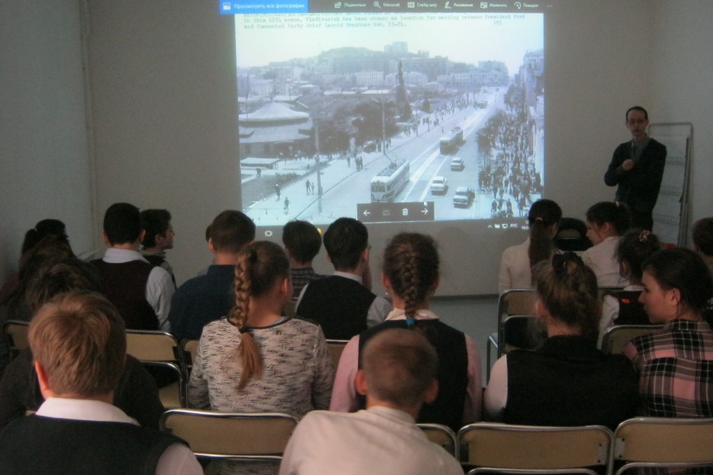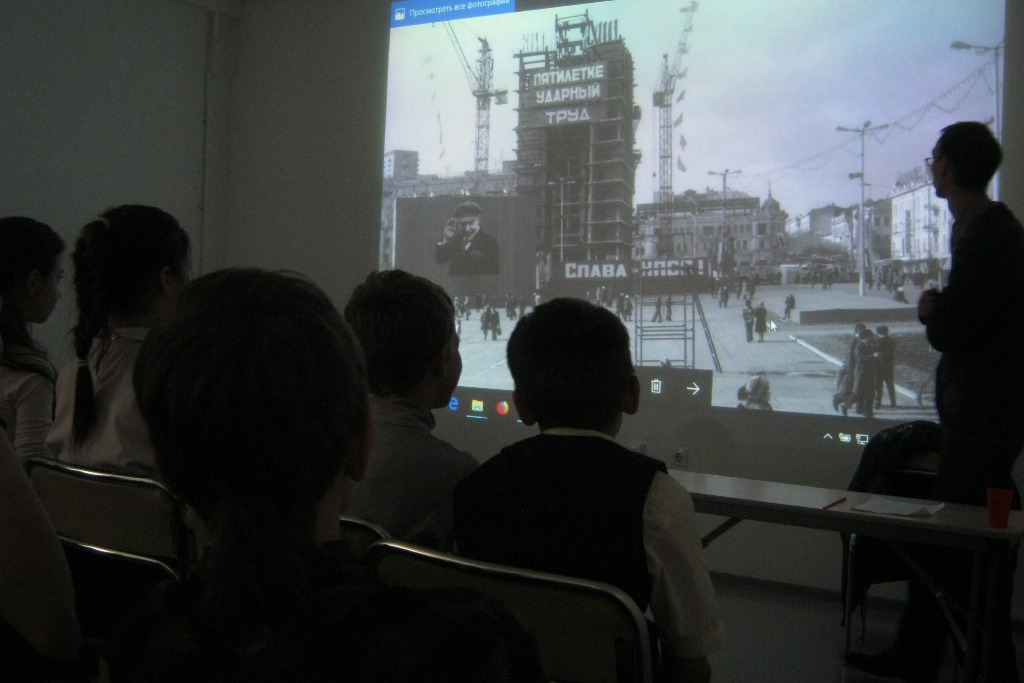 На лекции Сергея Корнилова восьмиклассники послушали о том, что было предметом жарких споров перед установкой скульптурной группы на центральной площади Владивостока и сами бурно комментировали современный вид города, сравнивая его с историческими снимками.