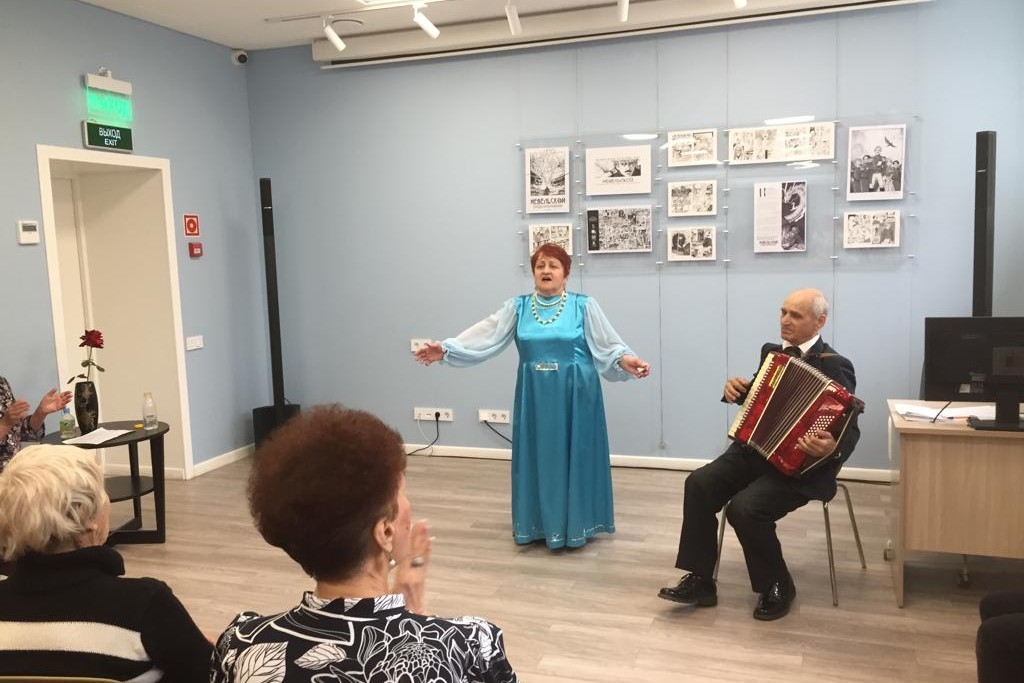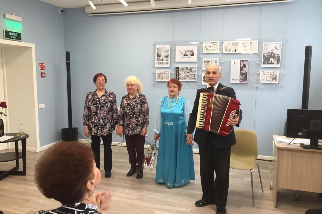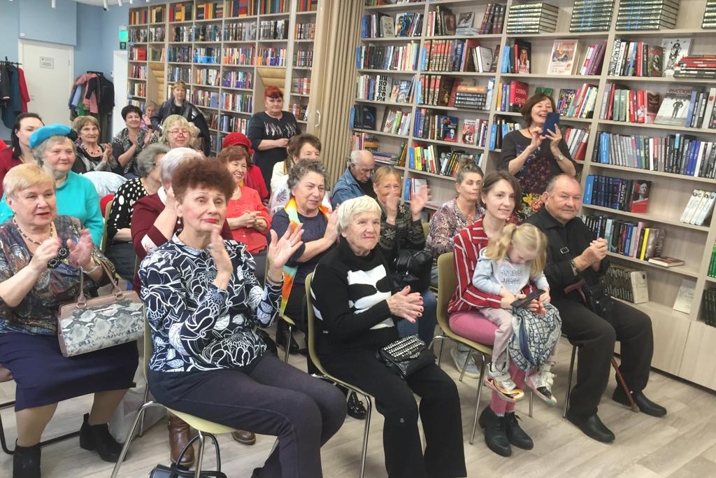 Хорошее настроение подарила читателям и гостям Центральной библиотеки им. А. Чехова, модернизированной в рамках национального проекта «Культура», Евгения Дмитриевна Якунина — солистка хора «С песней по жизни» 13 апреля.