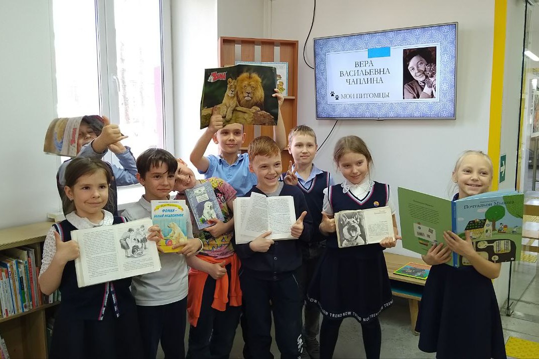 В библиотеке им. И.У. Басаргина, состоялись мероприятия для учащихся начальных классов МБОУ «СОШ № 64» и МБОУ «СОШ № 57». В ходе просмотра слайд-презентации «Мама всех зверей» ребята познакомились с творчеством Веры Васильевны. Ребята отгадывали загадки про животных и с большим восторгом просмотрели фрагмент документального фильма «Львица Кинули дома у Веры Чаплиной», в котором рассказывалось об эксперименте – поселении львицы и дикой собаки в квартире писательницы.