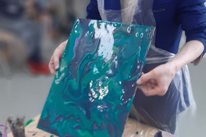 На практической части ребят познакомили с относительно новым, но уже достаточно популярным, направлением в живописи — флюид-арт, которое позволяет рисующим не только проявить свою индивидуальность и творческий потенциал, но и выразить свои эмоции и настроение. Подробно объяснив, какой материал нужен и как с ним работать в таких техниках как «Грязный стакан» или «Чаша хаоса», предоставили юным художникам свободу в выборе цветов и вариантов наливания флюида на холст, используя разные способы, такие как капельное наливание, вращение холста и др.