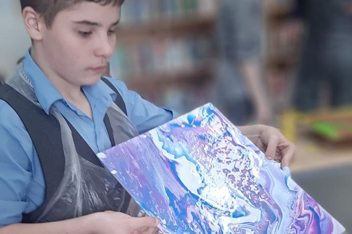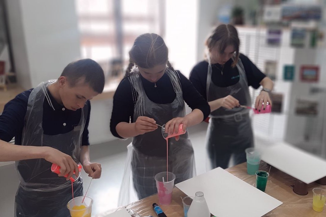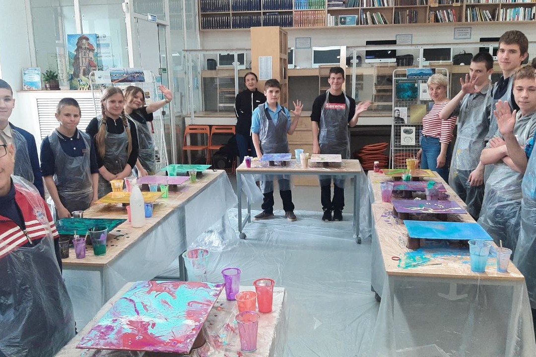 На практической части ребят познакомили с относительно новым, но уже достаточно популярным, направлением в живописи — флюид-арт, которое позволяет рисующим не только проявить свою индивидуальность и творческий потенциал, но и выразить свои эмоции и настроение. Подробно объяснив, какой материал нужен и как с ним работать в таких техниках как «Грязный стакан» или «Чаша хаоса», предоставили юным художникам свободу в выборе цветов и вариантов наливания флюида на холст, используя разные способы, такие как капельное наливание, вращение холста и др.
