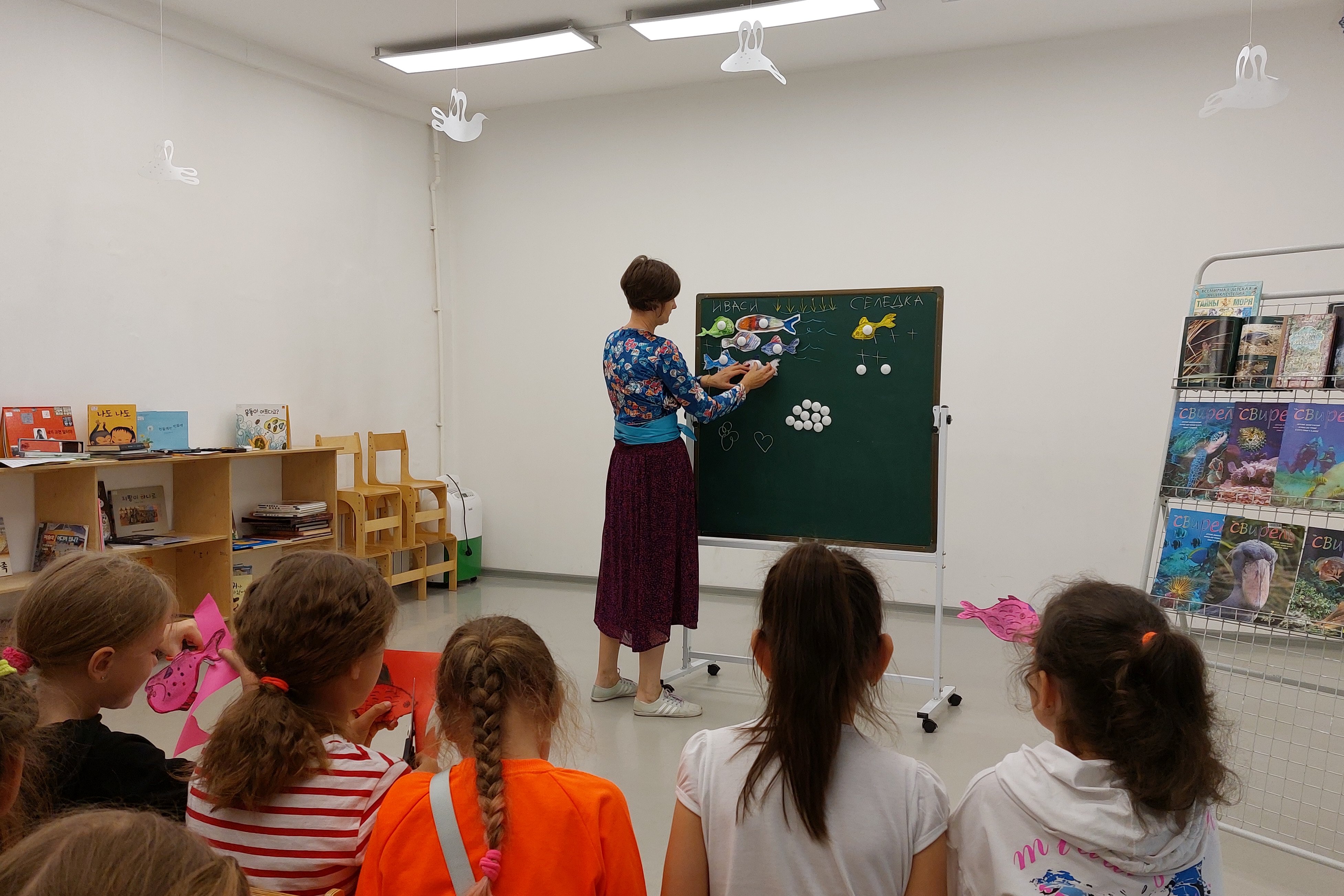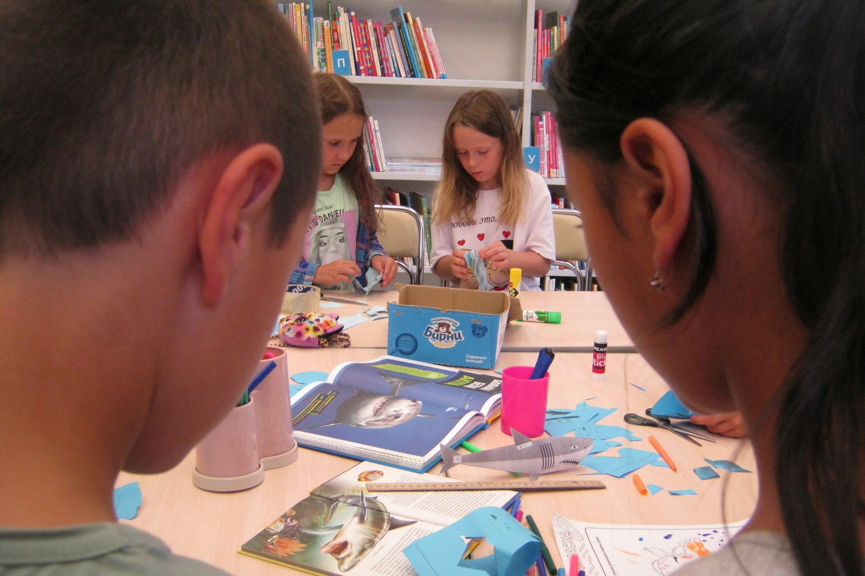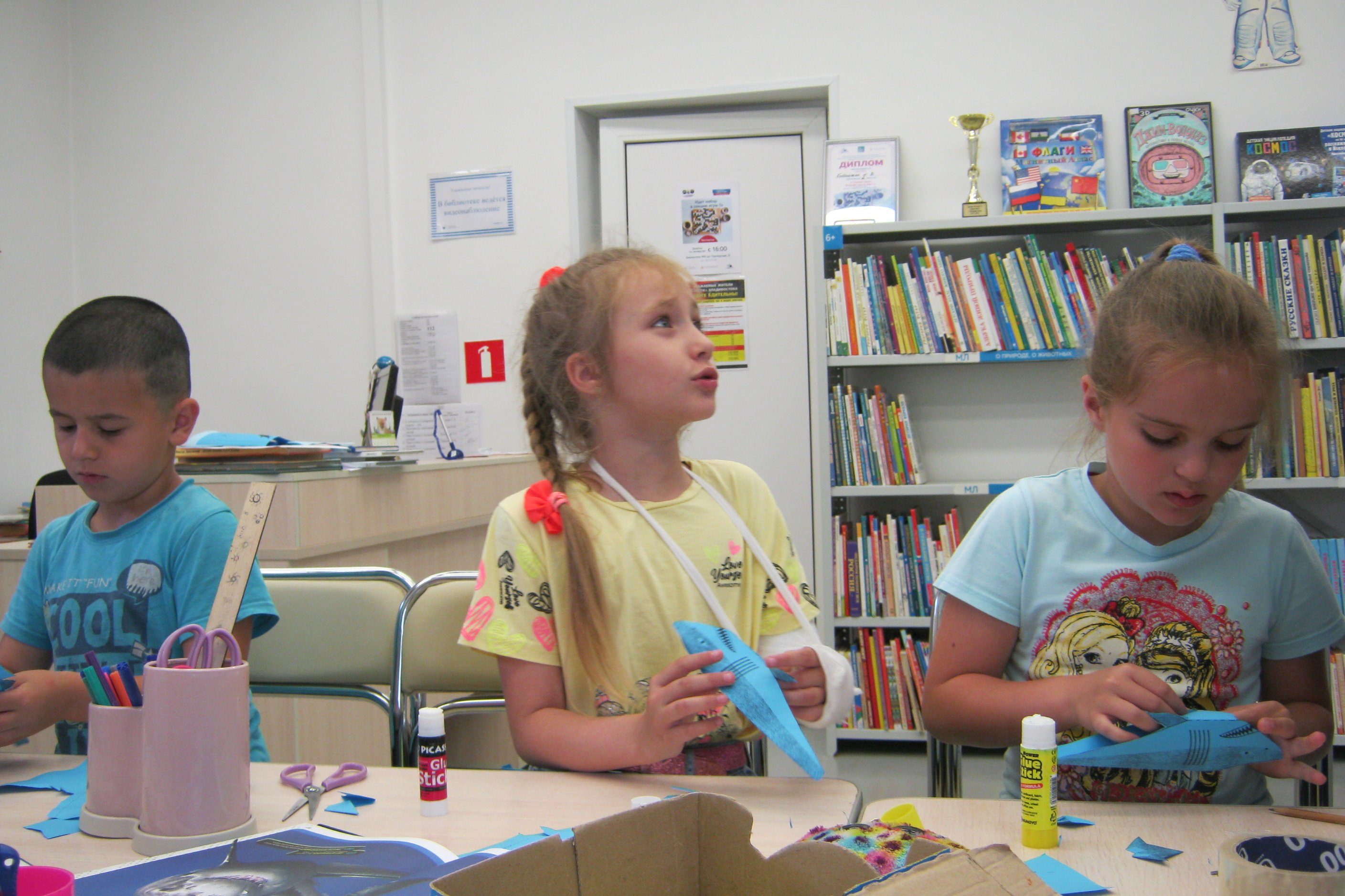 Между прочим, не только с замечательной детской зарубежной литературой знакомятся дети в библиотеке, но и российскими, приморскими именами, например, послушали маленький отрывок из рассказа «Сын таежного волка» дальневосточного писателя, знатока леса Михаила Деменка, где описаны всякие ночные звуки леса: филин, вальдшнеп, летучая мышь, изюбр. А на творческой мастерской, прежде чем приступить к поделке «стрекоза», детвора узнала, что исследователя Дальнего востока, ученого Владимира Арсеньева оказывается совсем не скучно читать, даже если ты еще не взрослый. Потому что есть книга «Встречи в тайге» с замечательными иллюстрациями и вкладышами с рисунками, например, развернув такой вкладыш, можно узнать, как выглядит светлячок или как называется черный с голубым жук – небесный усач. И уж тем более в библиотеке есть несколько детских энциклопедий, где можно посмотреть не только рисунки, но и фотографии зубастого морского обитателя, который вызывает у детей такое любопытство, что одна из самых частых просьб на творческой мастерской: «Когда мы будем делать акулу?».