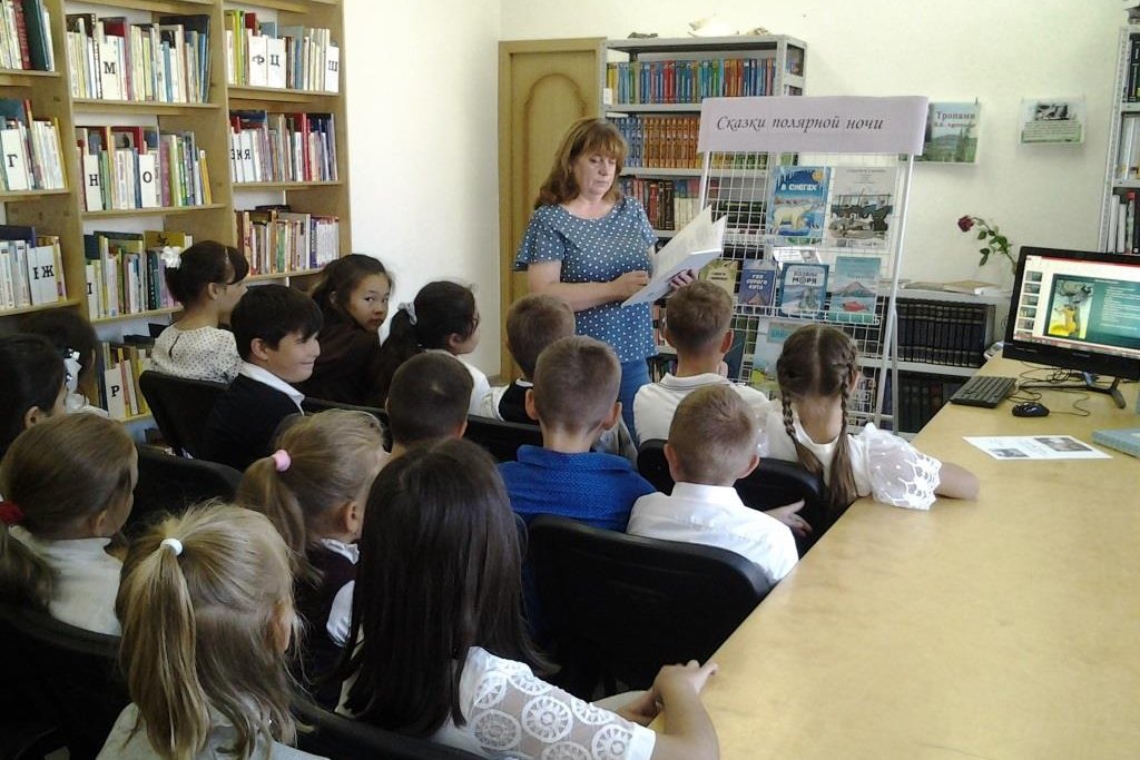 Четвероклассники приходили в библиотеку знакомиться со сказками народов Крайнего Севера России – «Сказки полярной ночи». Белые ночи, полярное сияние, бескрайний разлив серебристых снегов, тундра и тайга. На этой древней земле живут удивительные народы. Немногочисленные племена коренных народностей — энцев, ненцев, долган, нганасан и эвенков кочевали по просторам Севера — по Ямалу, Таймыру, Якутии и далее к Восточной Сибири. Суровый климат, незащищенность от болезней, сложность в ведении натурального хозяйства, наличие князей, купцов и шаманов — всё это формировало особый характер и духовный склад. Северный фольклор своеобразен и самобытен. В нем есть и житейская мудрость, и национальный колорит, и художественная выразительность.
