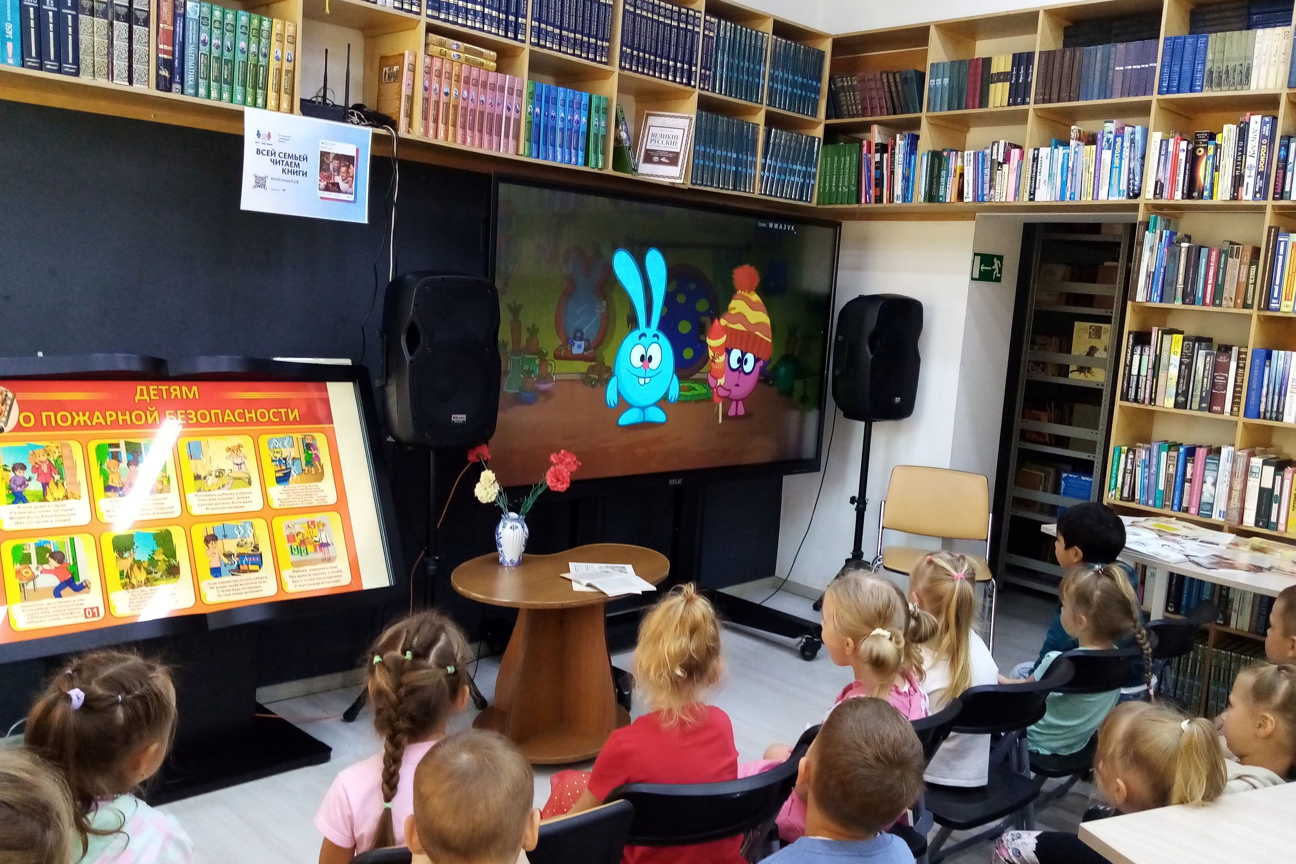 К мероприятию была оформлена книжная выставка «С огнем шутить нельзя». Книжки рассмотрели с большим интересом. Потом посмотрели мультфильм с любимыми Смешариками и вместе с героями мультика повторили то, что им известно по правилам пожарной безопасности.