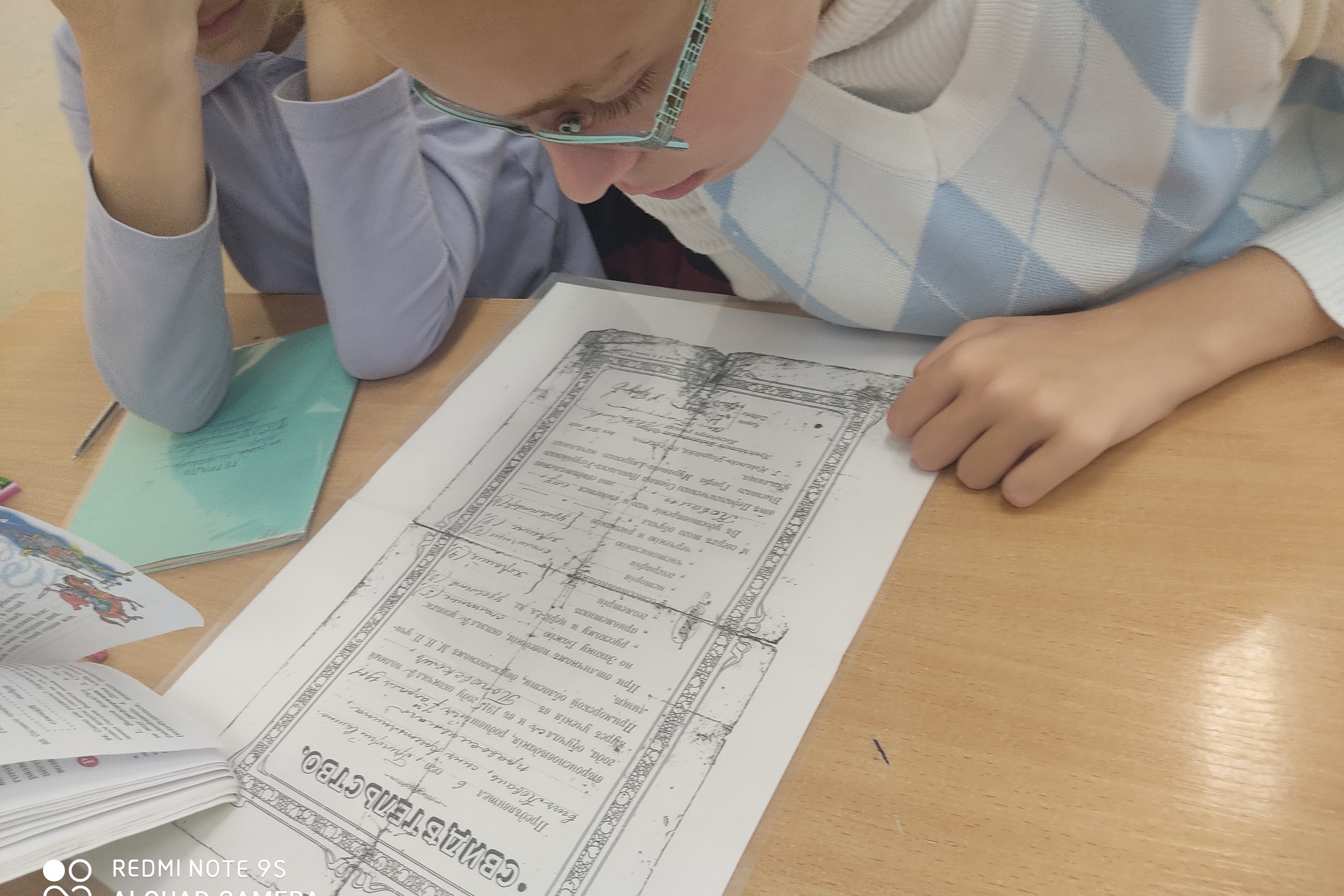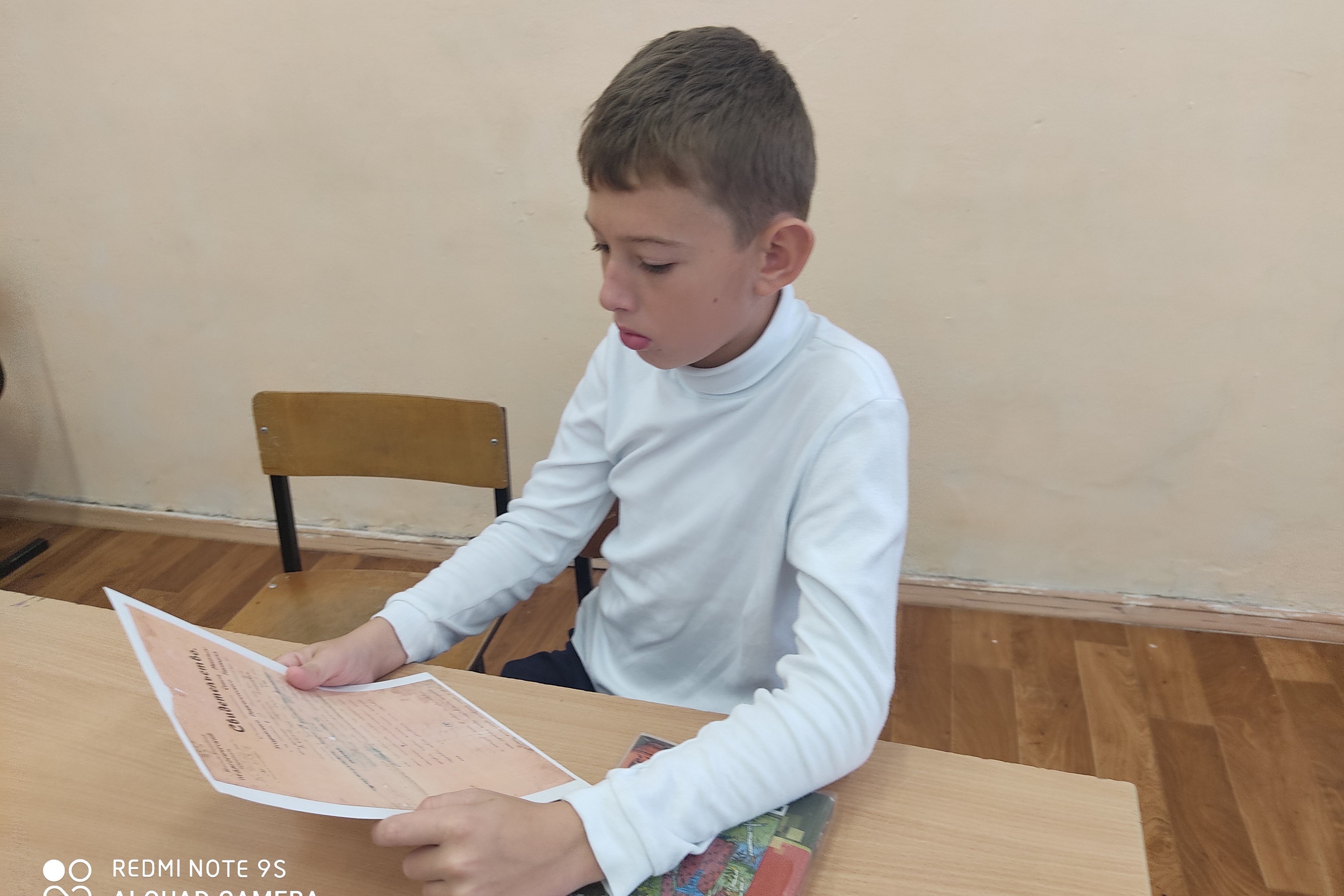 С первых же минут разговора Елены Васильевны пятиклассники начали внимательно вслушиваться в её слова по теме урока. Что такое род? Кто наши предки? Что мы знаем о них на протяжении к примеру, ста последних лет? Дети попытались дать ответ, но с первой попытки не получилось, вдруг выяснилось, что мало кто знает даже имена прабабушек и прадедушек. С собой Елена Васильевна взяла некоторые документы столетней и более давности, люди, владевшие ими, умерли, но документы остались. Особо понравилось ребятам «Свидетельство» об окончании учебного заведения 1915г. С любопытством современные школьники вчитывались в графу предмет и оценка успеваемости. Выяснилось, что это мальчик 14 лет изучал всего 7 предметов, в том числе «Закон Божьего слова». И имел по этому предмету – пять. Не заладилось у молодого ученика черчение и рисование – 3. Школьники поддержали далекого соплеменника, указав на то, что и сегодня рисование дается с большим трудом.