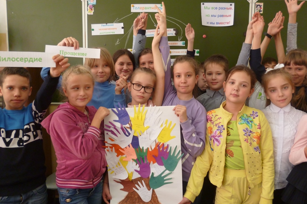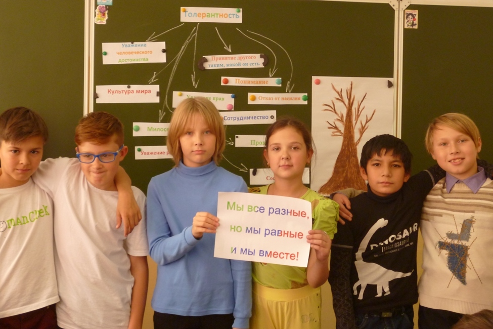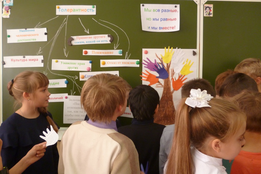 Во время мероприятия школьники познакомились с культурным и национальным многообразием России, принципами и символами толерантности, обсудили и наглядно проанализировали, чем они отличаются друг от друга и что их объединяет, придумали свой «хоровод дружбы». Затем все вместе мастерили «Дерево толерантности», на листочках-ладошках которого написали свои имена и пожелания всем людям планеты, чтобы жизнь была счастливой и спокойной, а люди, которые нас окружают, всегда понимали, уважали и ценили друг друга, чтобы мир был окутан атмосферой добра и щедрости. Они говорили о том, что это дерево будет жить, пока они дружны, но если будут между ними ссоры, то их ладошки начнут опадать, как листочки с дерева, которое осталось без полива.