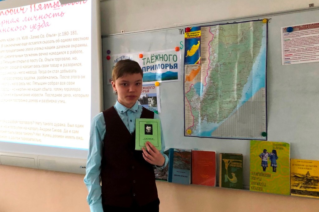 11 декабря учащиеся 8 «В» класса школы №57 в библиотеке им. И.У. Басаргина выяснили, что произведения фольклорной несказочной прозы могут быть не только приурочены к реальному времени и местности, но и связаны с реальными лицами. Далее на слайдах электронной презентации перед школьниками предстали образы легендарных первопроходцев Сибири и Дальнего Востока, было отмечено, что легенды и предания о них имеют установку на достоверность описываемых событий. Затем школьники познакомились с легендами и преданиями о реальных персонажах: первых поселенцах, охотниках, искателях женьшеня из сборника «У ключика у гремучего».