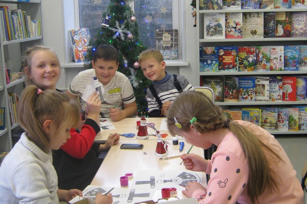 На творческих мастерских в библиотеке №8 воцарилась новогодняя атмосфера. На полках стеллажа в детском абонементе расположилась до марта «Библиотека Деда Мороза» — детские книги о новогодних играх, чудесах и сказках. Впрочем, и родителям в «Библиотеке Деда Мороза» можно себе найти парочку книг с новогодними историями от современных российских писателей, ведь и взрослым, особенно когда они устают, бывает необходимо почувствовать предвкушение праздника и возможность чудес. Около стеллажа с новогодними книгами, конечно, стоит елочка и мерцает огоньками гирлянды. Вот для этой елочки, элегантно и сдержанно украшенной, на творческой мастерской 17 декабря дети делали украшения в виде маленьких Дедов Морозов.