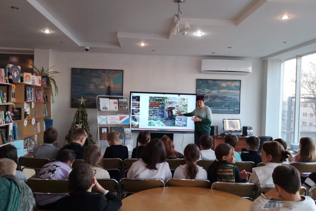 Несколько ранее, 5 декабря, в библиотеке в рамках программы прошел патриотический час «Город воинской славы» для учащихся 2 «б» класса МБОУ СОШ № 26. Второклассникам рассказали, когда и почему звание Город воинской славы было присвоено Владивостоку, об охране дальневосточных рубежей России пограничниками, моряками и сухопутными войсками. Презентация и музыкальное сопровождение открыли яркую и героическую историю и современность нашего края. Ребята внимательно слушали о подвиге крейсера «Варяг» (песня «Врагу не сдается наш гордый «Варяг»»), о героях гражданской войны (песня «По долинам и по взгорьям»), о хасанских событиях (песня «Катюша»), о танковой колонне «Приморский комсомолец», о манчжурской операции 1945 года. Посетили школьники и Памятник приморцам, погибшим в ходе локальных войн и военных конфликтов на Аллее героев (это 23 гранитные звезды, на которых выгравированы 200 фамилий Героев Советского Союза и 8 фамилий Героев России). В заключении стоя пели гимн города, обсуждали памятные места, которые необходимо посетить, просмотрели литературу, представленную на выставке.