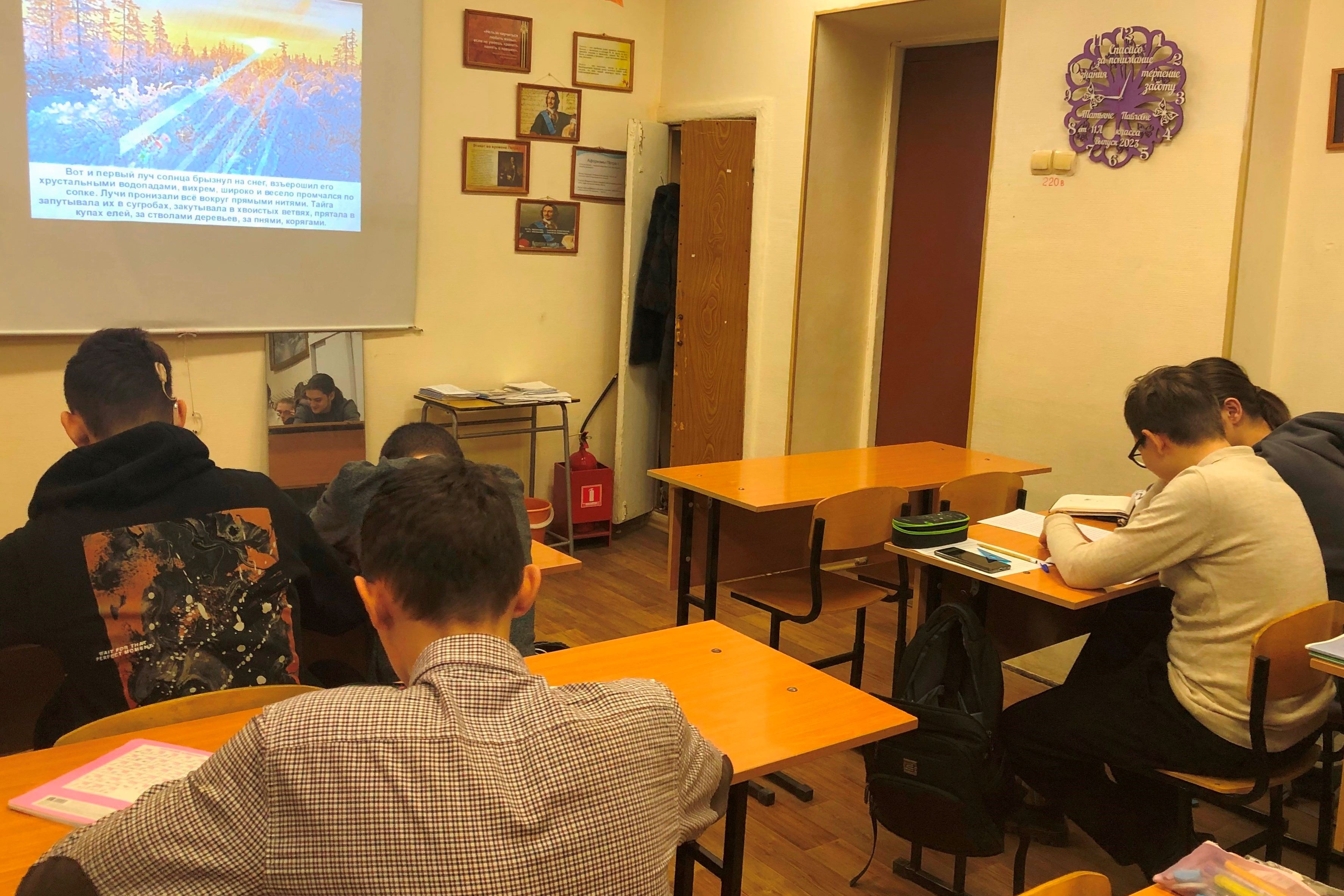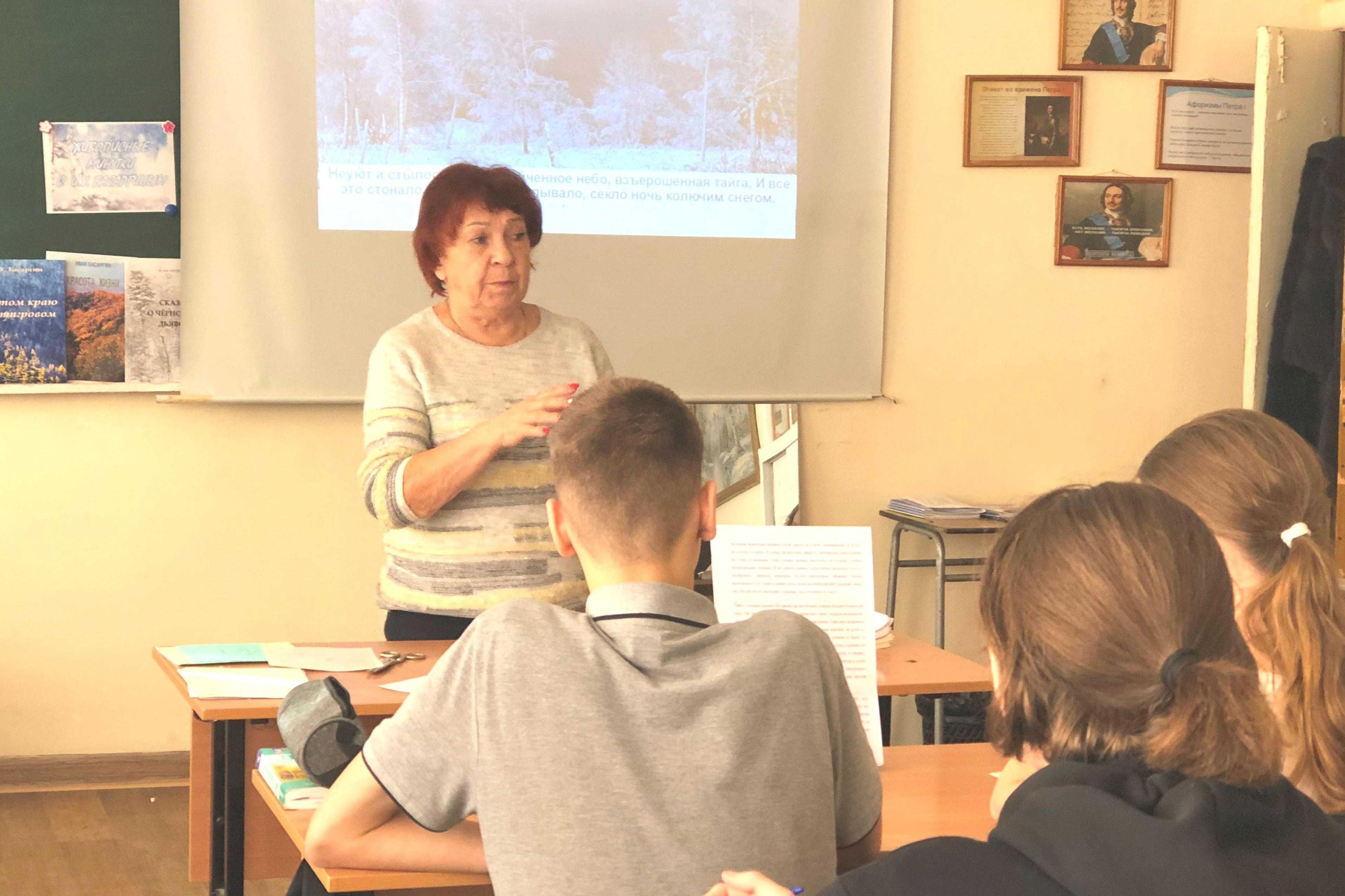 Девятиклассники познакомились с великолепными строками о зимней тайге из романов, повестей, рассказов И.У. Басаргина, выразительно прочитали их, обращая внимание на постановку ударения, сопоставили с предложенными иллюстрациями.